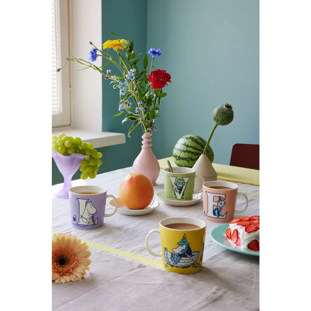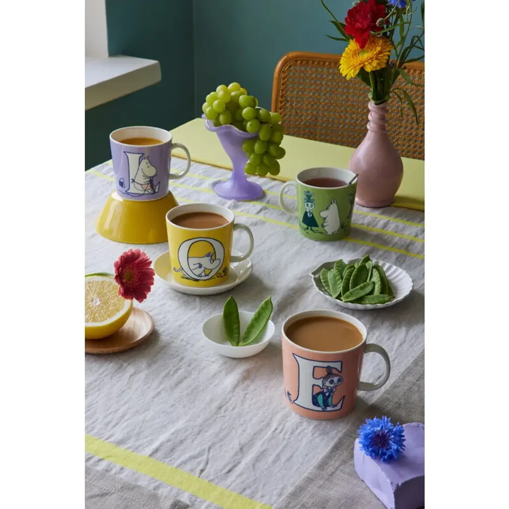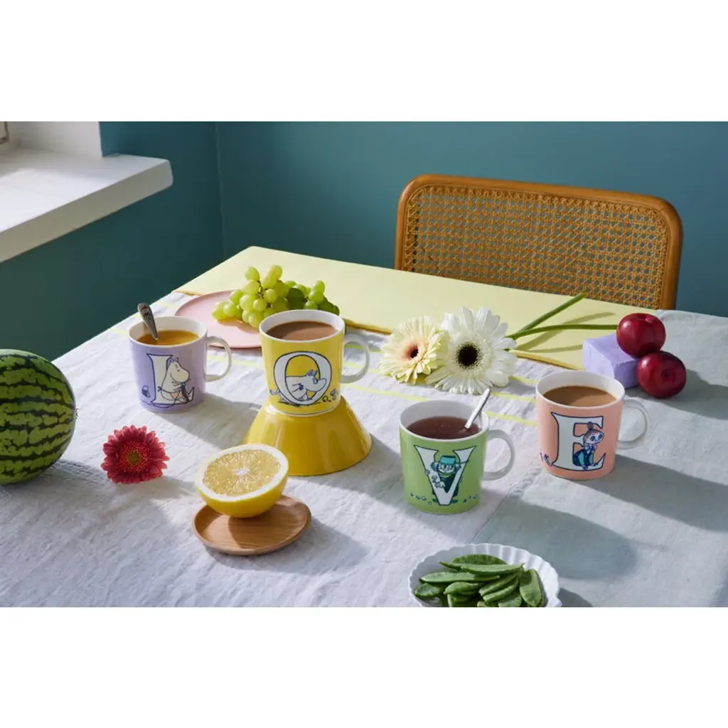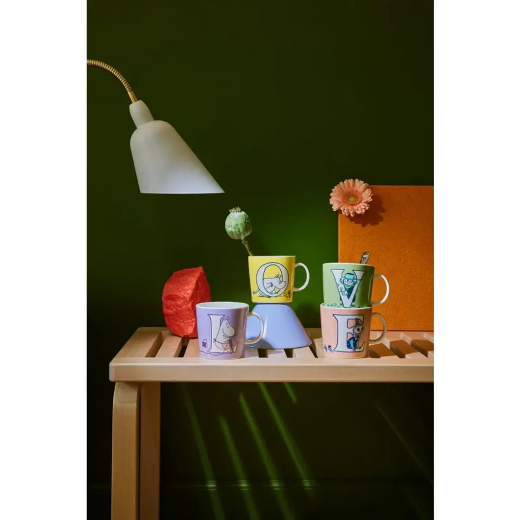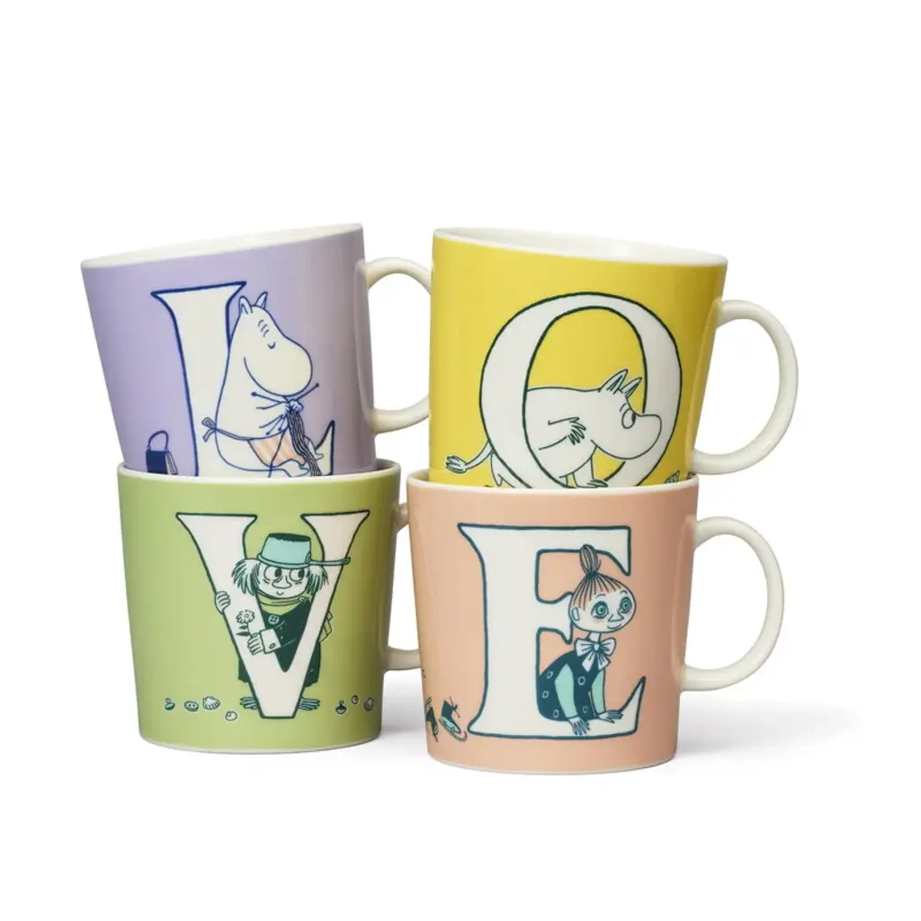 The Moomin ABC mugs are decorated with adorable initials featuring various Moomin characters. The L mug features Moominmamma who has decided to live in a cave with Moominpappa. When the kids find them, however, they agree to return home to the Moominhouse. The illustration on the mug’s other side is based on the comic Moomin Family Life. The L mug is part of the “Reading, writing and the Moomins” initiative that promotes the importance of literacy and the joys of reading. The mugs' Moomin alphabet is based on Tove Jansson’s hand-drawn initial capitals and lettering created for the book The Memoirs of Moominpappa as well as her maps of Moominvalley. The mugs' form is familiar from the Iittala Teema series, but in contrast to most Moomin mugs, the ABC mugs’ size is larger: 13.53 x 0 fl oz (4 x dl. dl). Which words would you form with the Moomin letters?
