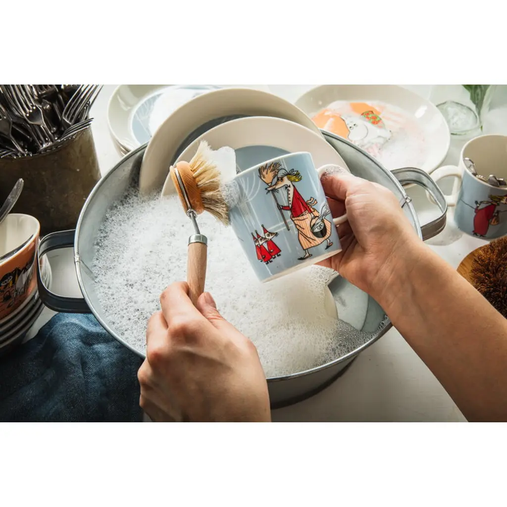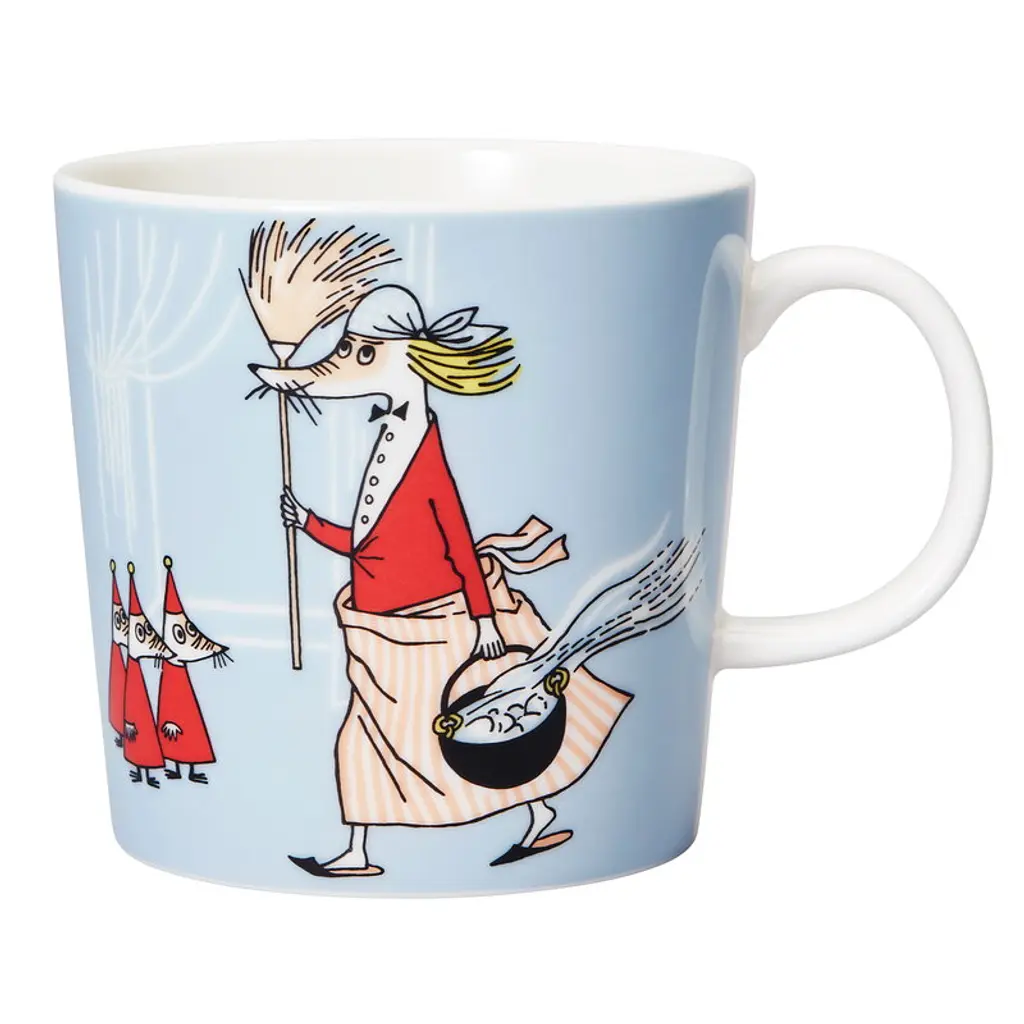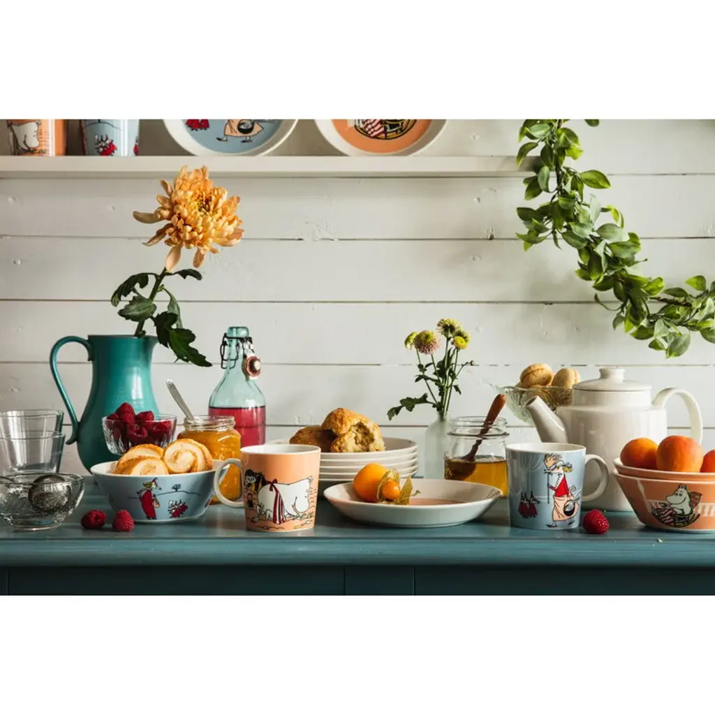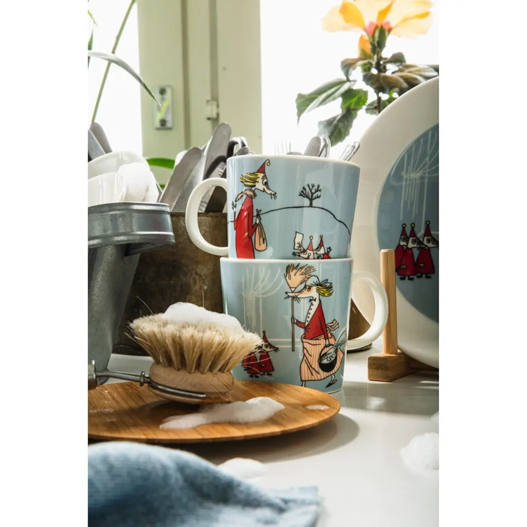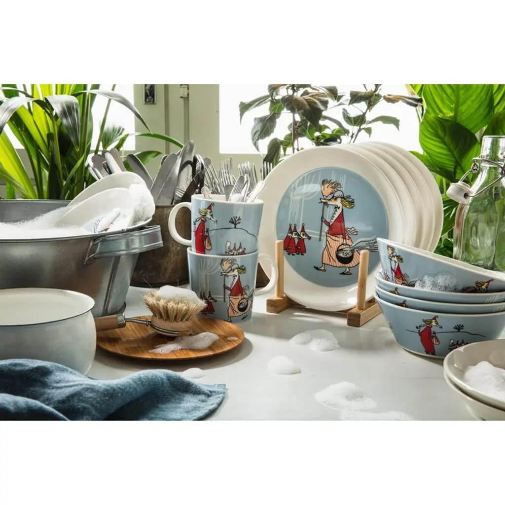 The Fillyjonk mug from Arabia’s Moomin collection features an illustration of Mrs. Fillyjonk, a strict, tidy and sometimes even neurotic character who believes a clean home is key for keeping your life in order. In the illustration, Fillyjonk’s children bring her a telegram announcing the arrival of a ladies’ committee – and so, Fillyjonk starts scrubbing the house for the visitors, as the mug’s reverse side shows. The mugs, bowls and plates of Arabia’s Moomin Classics tableware collection illustrate the characters of Moominvalley. The first pieces of Arabia’s Moomin tableware came out already in the 1950s, and their large-scale production began in 1990. All the illustrations are done by Tove Slotte who draws inspiration from the original drawings by Tove Jansson. The form of the collection comes from Arabia’s timeless ceramic Teema tableware designed by Kaj Franck.