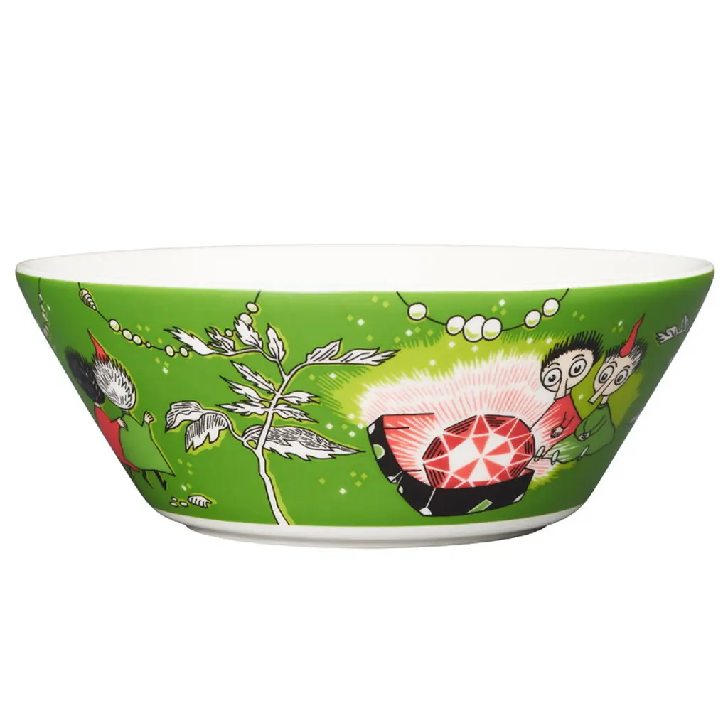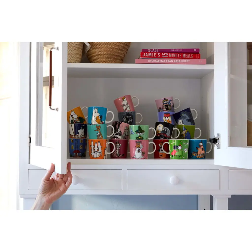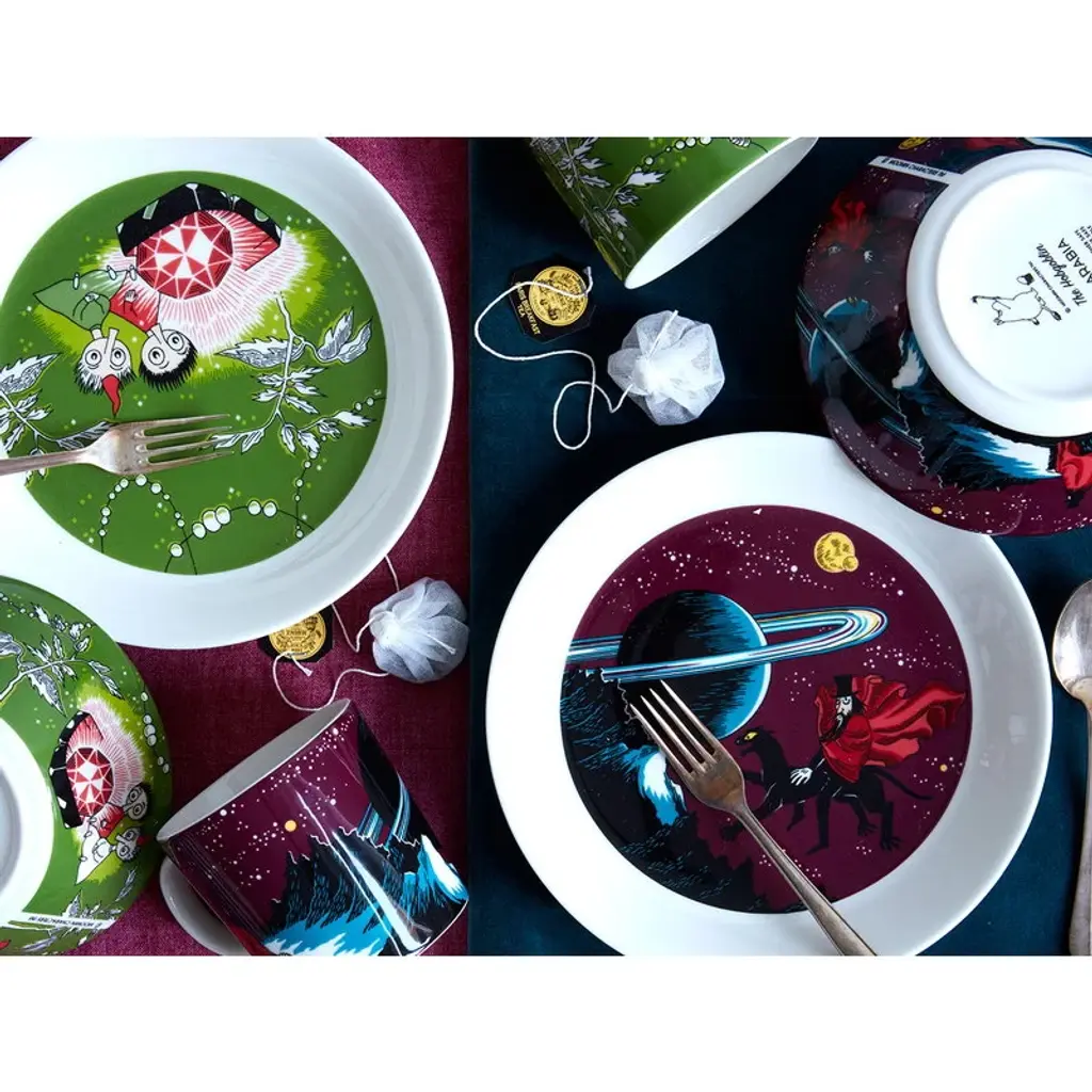 Thingumy and Bob mug from Arabia’s beloved Moomin collection portrays the two tiny friends amazed by the glow of the gigantic King’s Ruby. Tove Slotte’s illustration is based on Tove Jansson’s story The Magician's Hat from 1948, where the mysterious Hobgoblin arrives in the Moominvalley in a search of the greatest ruby in the world. The ceramic Moomin mugs are great for serving tea, coffee as well as hot chocolate and will cheer up any table setting. The mugs, bowls and plates of Arabia’s Moomin Classics tableware collection illustrate the characters of the Moominvalley from the front and behind. First pieces of Arabia’s Moomin tableware came out already in the 1950s, and the large-scale production began in 1990. All the illustrations are done by Tove Slotte who draws inspiration from the original drawings by Tove Jansson. The form of the collection comes from Arabia’s timeless, ceramic Teema tableware designed by Kaj Franck.