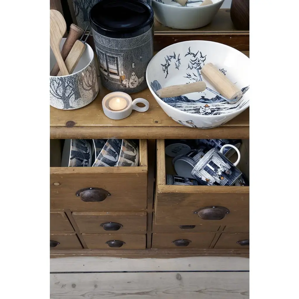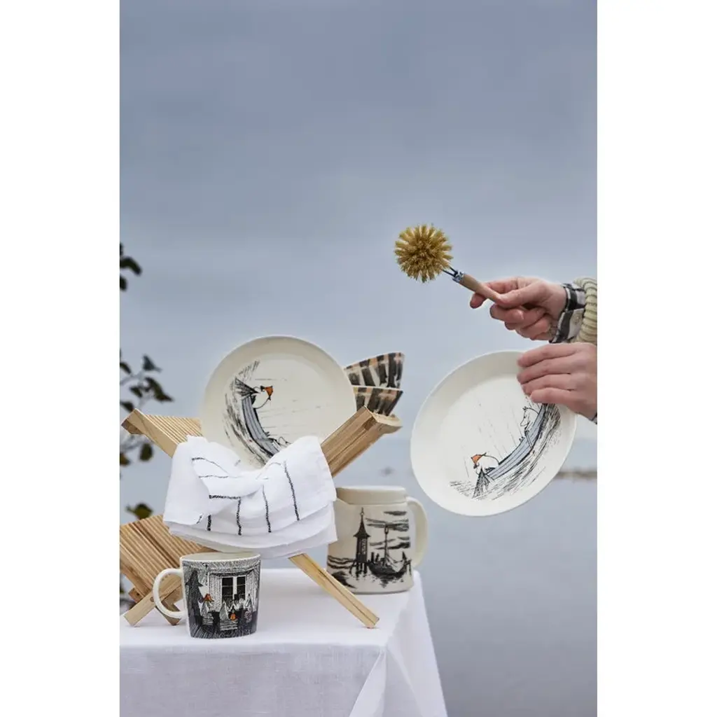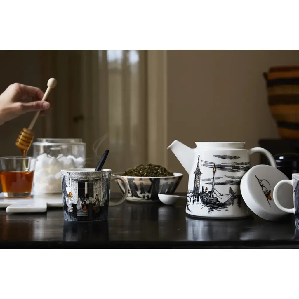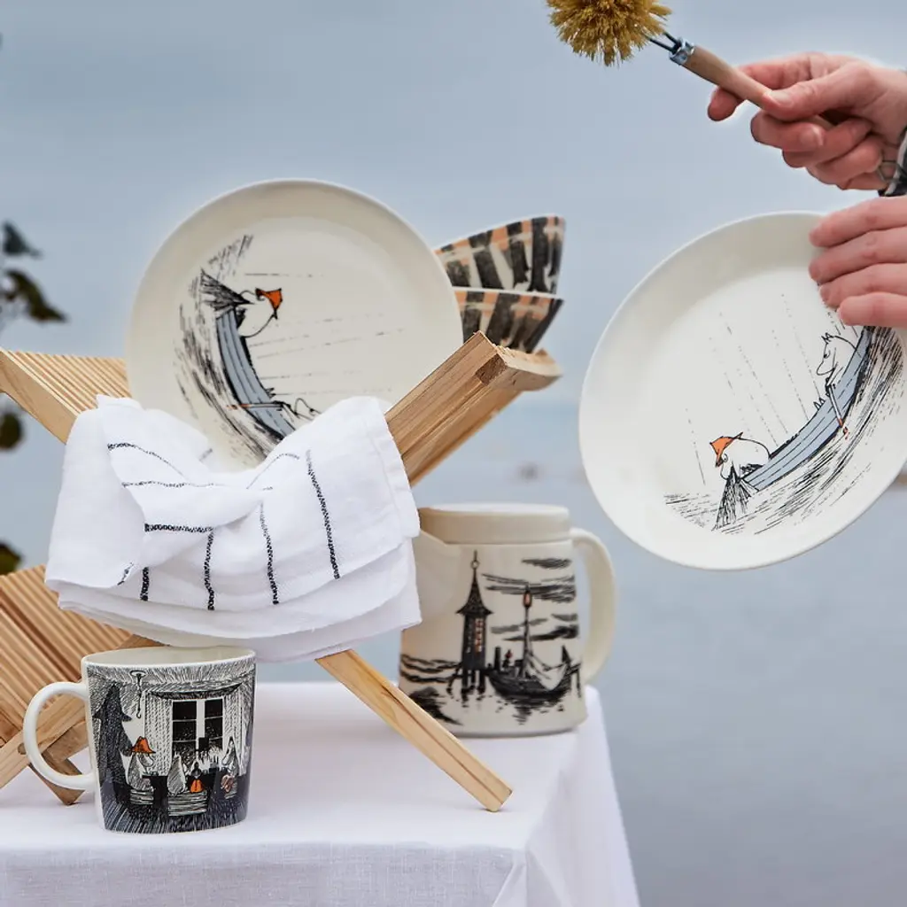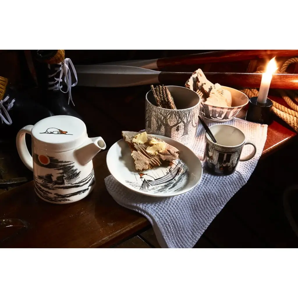 Arabia’s Moomin mug True to Its Origins is part of a tableware collection inspired by Tove Jansson’s novels Moominpappa at Sea (1965) and Moominvalley in November (1970). The first one tells the story of the Moomin family moving to a far-away lighthouse island, and the latter is the artist’s last Moomin book that she wrote after her mother had passed away. The themes of the books – longing, loneliness and turning points in life – are conveyed in the ceramic teapot, jar, plate, bowl and mug through Jansson’s beautiful, melancholy illustrations. First pieces of Arabia’s Moomin tableware came out already in the 1950s, and the large-scale production began in 1990. The form of the collection comes from Arabia’s timeless, ceramic Teema tableware designed by Kaj Franck.