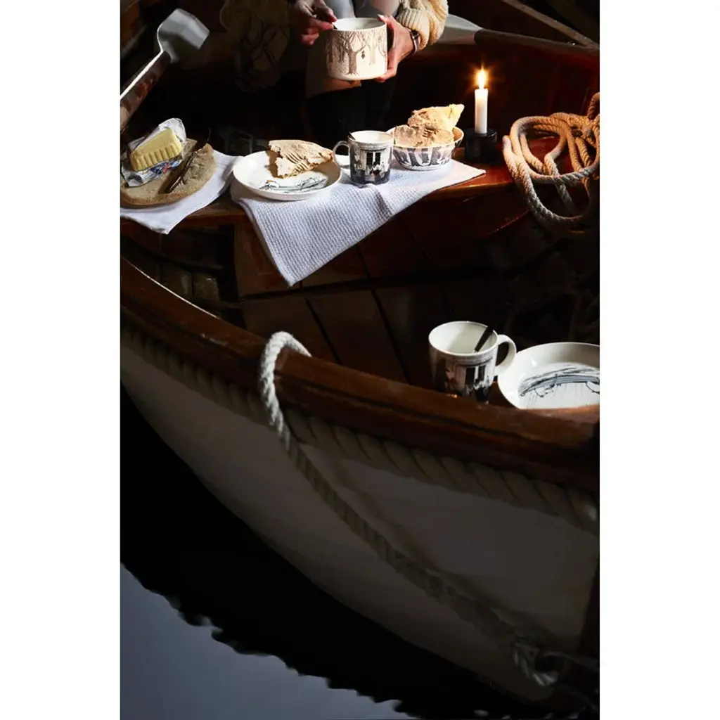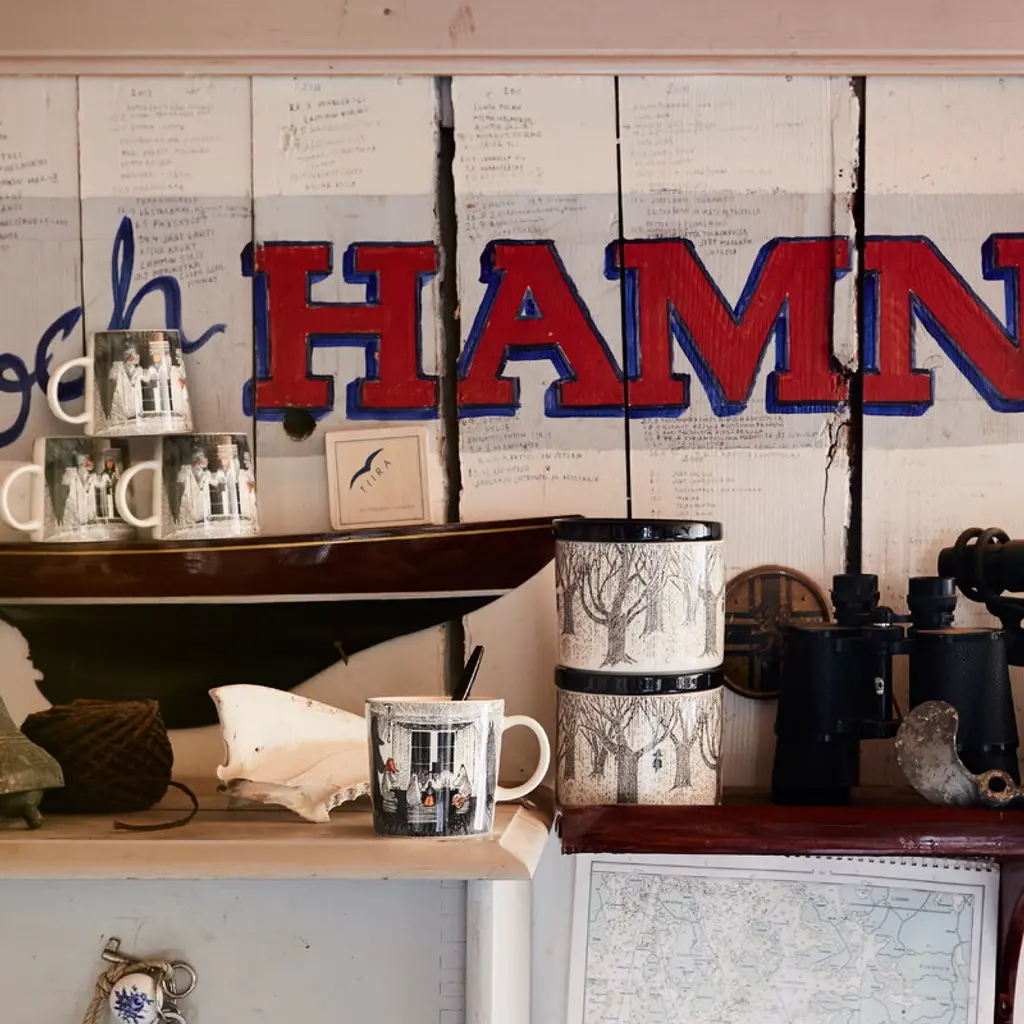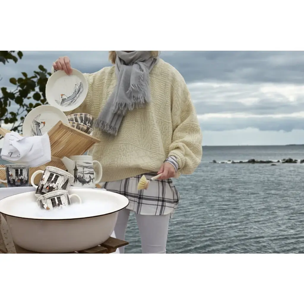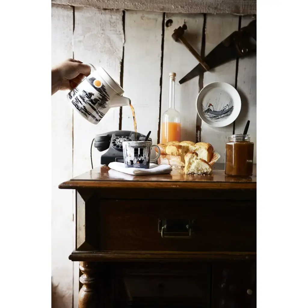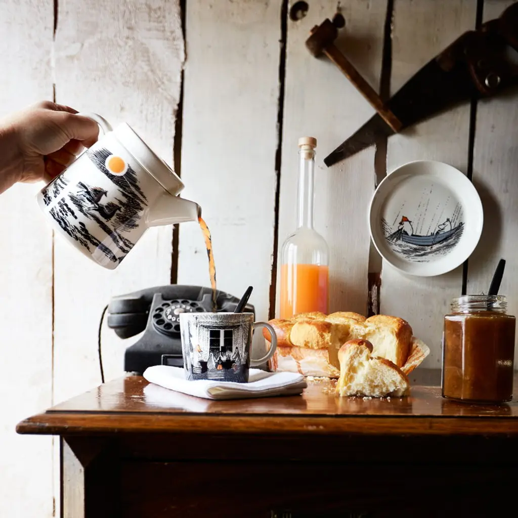 Arabia’s Moomin mug True to Its Origins is part of a tableware collection inspired by Tove Jansson’s novels Moominpappa at Sea (1965) and Moominvalley in November (1970). The first one tells the story of the Moomin family moving to a far-away lighthouse island, and the latter is the artist’s last Moomin book that she wrote after her mother had passed away. The themes of the books – longing, loneliness and turning points in life – are conveyed in the ceramic teapot, jar, plate, bowl and mug through Jansson’s beautiful, melancholy illustrations. First pieces of Arabia’s Moomin tableware came out already in the 1950s, and the large-scale production began in 1990. The form of the collection comes from Arabia’s timeless, ceramic Teema tableware designed by Kaj Franck.