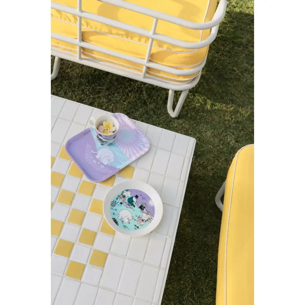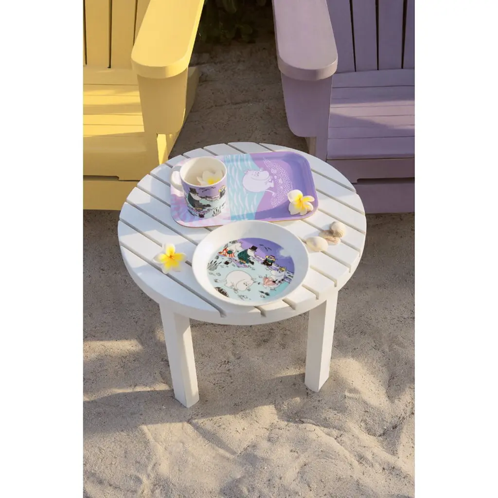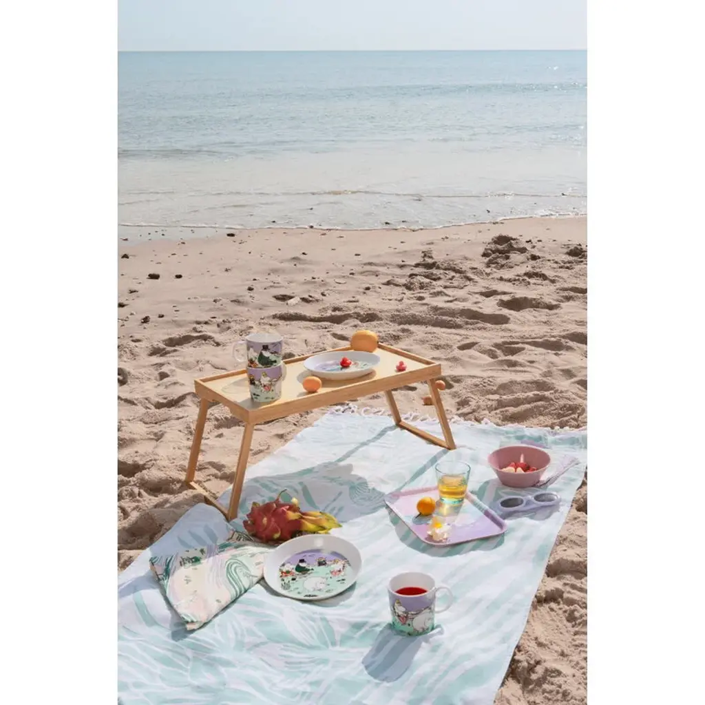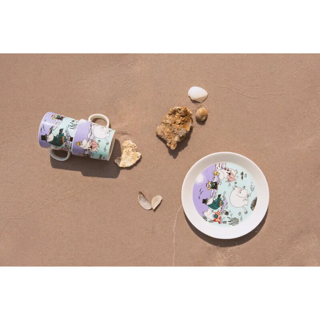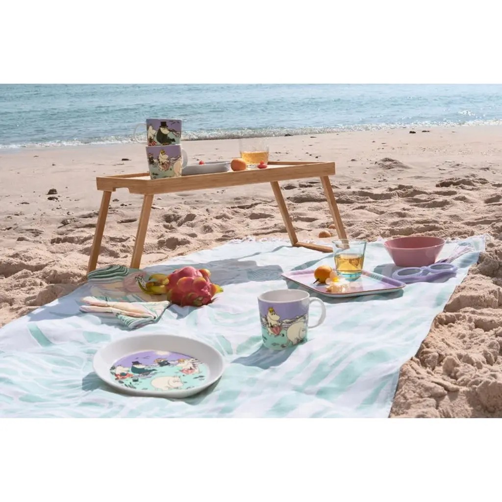 Moomin Arabia's Beach Day plate is the seasonal Moomin plate for summer 2025, capturing a carefree seaside moment with the Moomin family. While Moomintroll is happily immersed in collecting beautiful seashells, he stumbles upon another passionate collector – The Fuddler, who's on the lookout for unusual buttons. Illustrated by Parvati Pillai in breezy turquoise and soft violet tones, the design is inspired by Fuddler's Courtship, a 1959 comic strip by Tove and Lars Jansson. Arabia's Moomin Summer Seasonals tableware set arrives annually as summer begins and is available only for a limited period. The tableware, inspired by the summer vibes of Moominvalley, features cheerful characters selected from Tove Jansson's original drawings. The core tableware for the Moomin series is Kaj Franck's Teema collection, known for its timeless practicality.