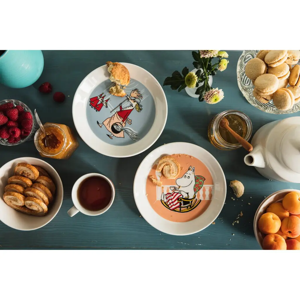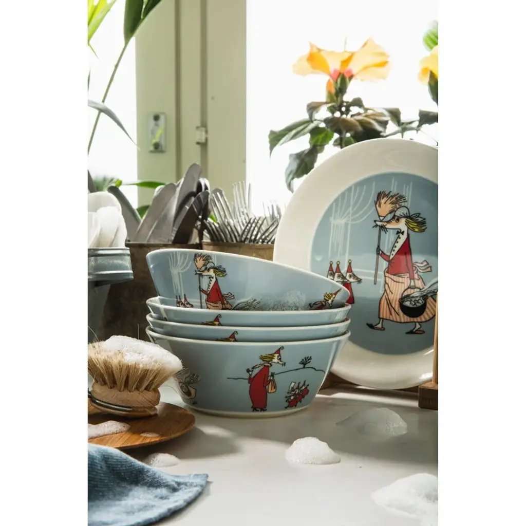 The Fillyjonk plate from Arabia’s Moomin collection features an illustration of Mrs. Fillyjonk, a strict, tidy and sometimes even neurotic character who believes a clean home is key for keeping your life in order. One time, Fillyjonk is cured from her cleaning complex and lets her house get run down. Moominmamma knows just what to do: she lets Fillyjonk believe that a ladies’ committee is coming for a visit – in the illustration, Fillyjonk has started to scrub the home to prepare for their arrival. The mugs, bowls and plates of Arabia’s Moomin Classics tableware collection illustrate the characters of Moominvalley. The first pieces of Arabia’s Moomin tableware came out already in the 1950s, and their large-scale production began in 1990. All the illustrations are done by Tove Slotte who draws inspiration from the original drawings by Tove Jansson. The form of the collection comes from Arabia’s timeless ceramic Teema tableware designed by Kaj Franck.