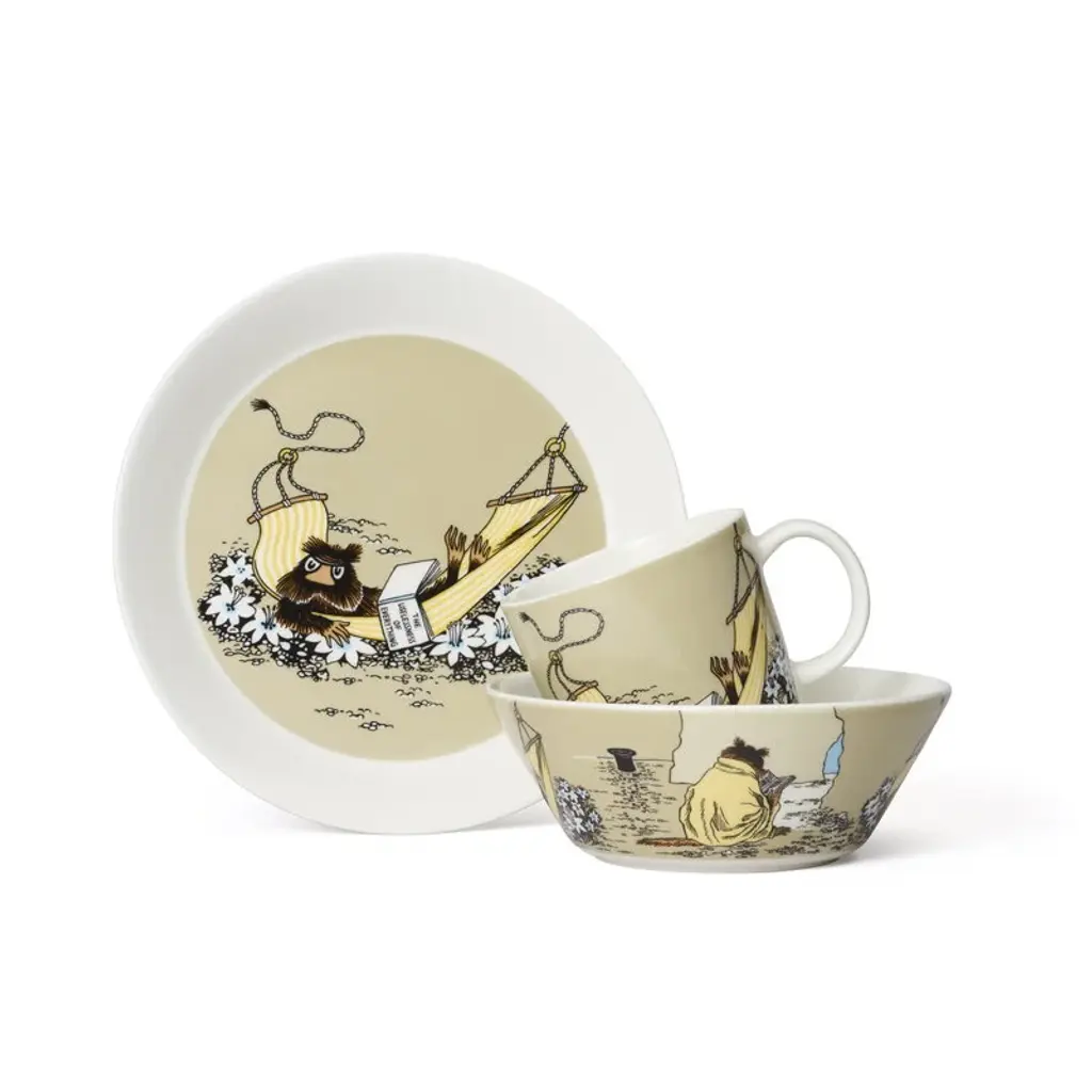 The Muskrat plate by Moomin Arabia features a seldom-seen character, a serious-minded philosopher who prefers the company of his own pessimistic thoughts or perhaps a book of equally pessimistic nature. In Muskrat's view, everything is futile – a sentiment he is sure to share with anyone around him – yet he insists on maintaining his own dignity. Arabia's Moomin Classics tableware collection brings to life the cherished inhabitants of Moominvalley across its mugs, bowls, and plates. This collection is a fusion of Finnish cultural icons: Tove Jansson, the creator of the Moomins, and Kaj Franck, a legendary designer. Featuring illustrations drawn from Jansson's original Moomin artworks and shaped by the timeless forms of Franck's Teema tableware, this series is a celebration of Finnish design and storytelling.