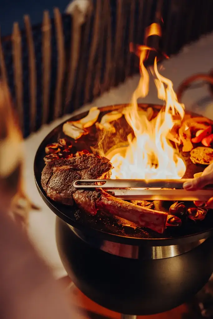 Moon 45 Plancha is a continuous ring that can be used as a cooking surface on wood or pellet fires.Stable support with integrated three-point system.Excellent heat retention and non-stick coating for low-fat cooking and grilling.Lowered with outer edge to prevent fat or food from falling off.Plancha: enamelled cast iron, optimum heat retention