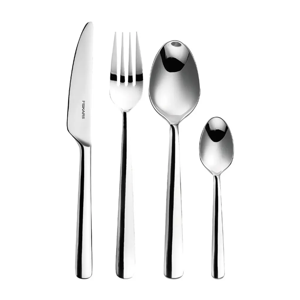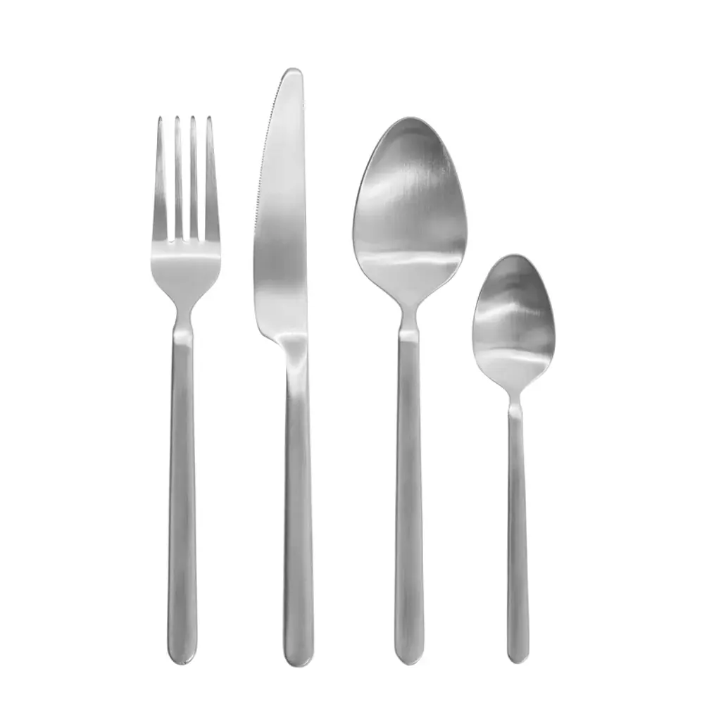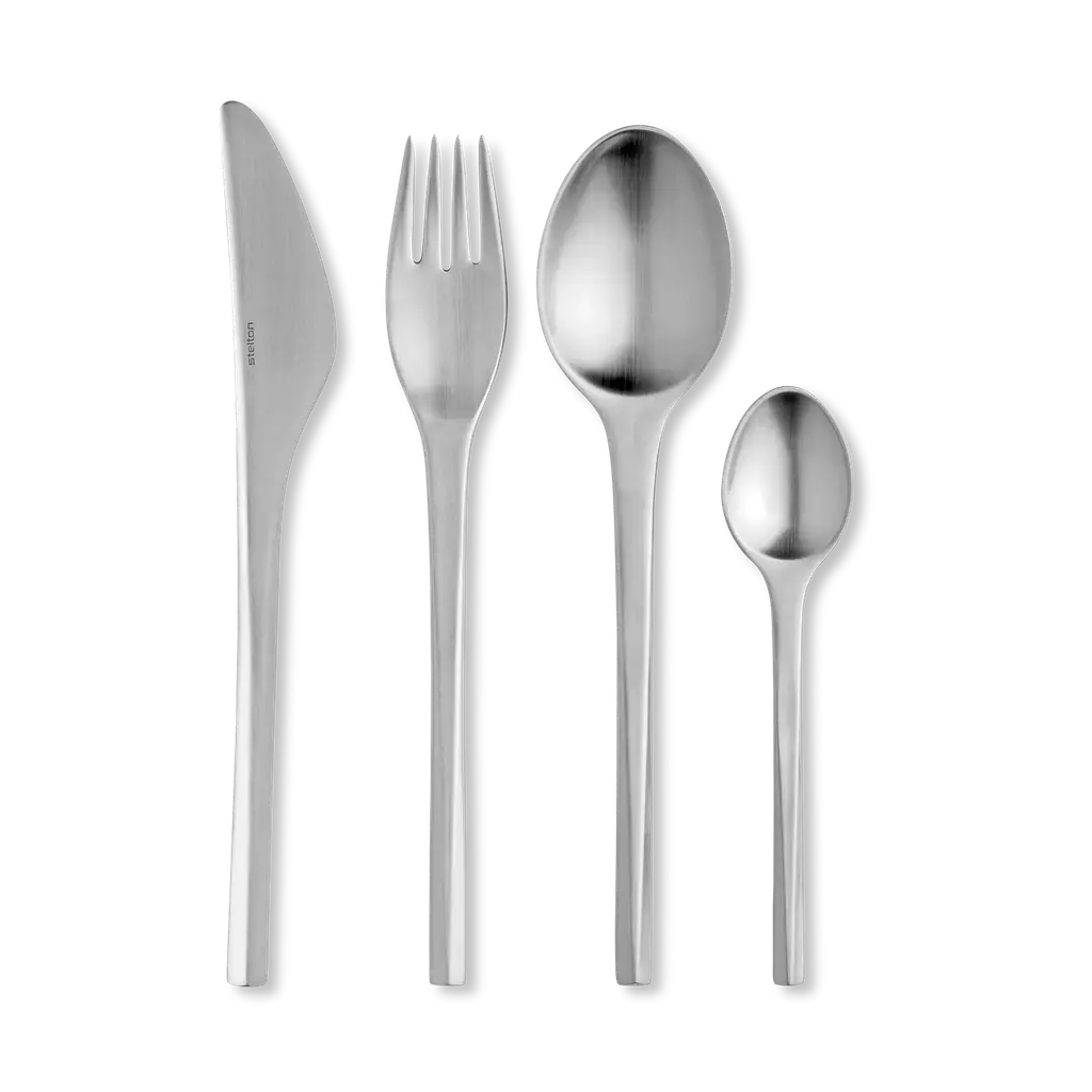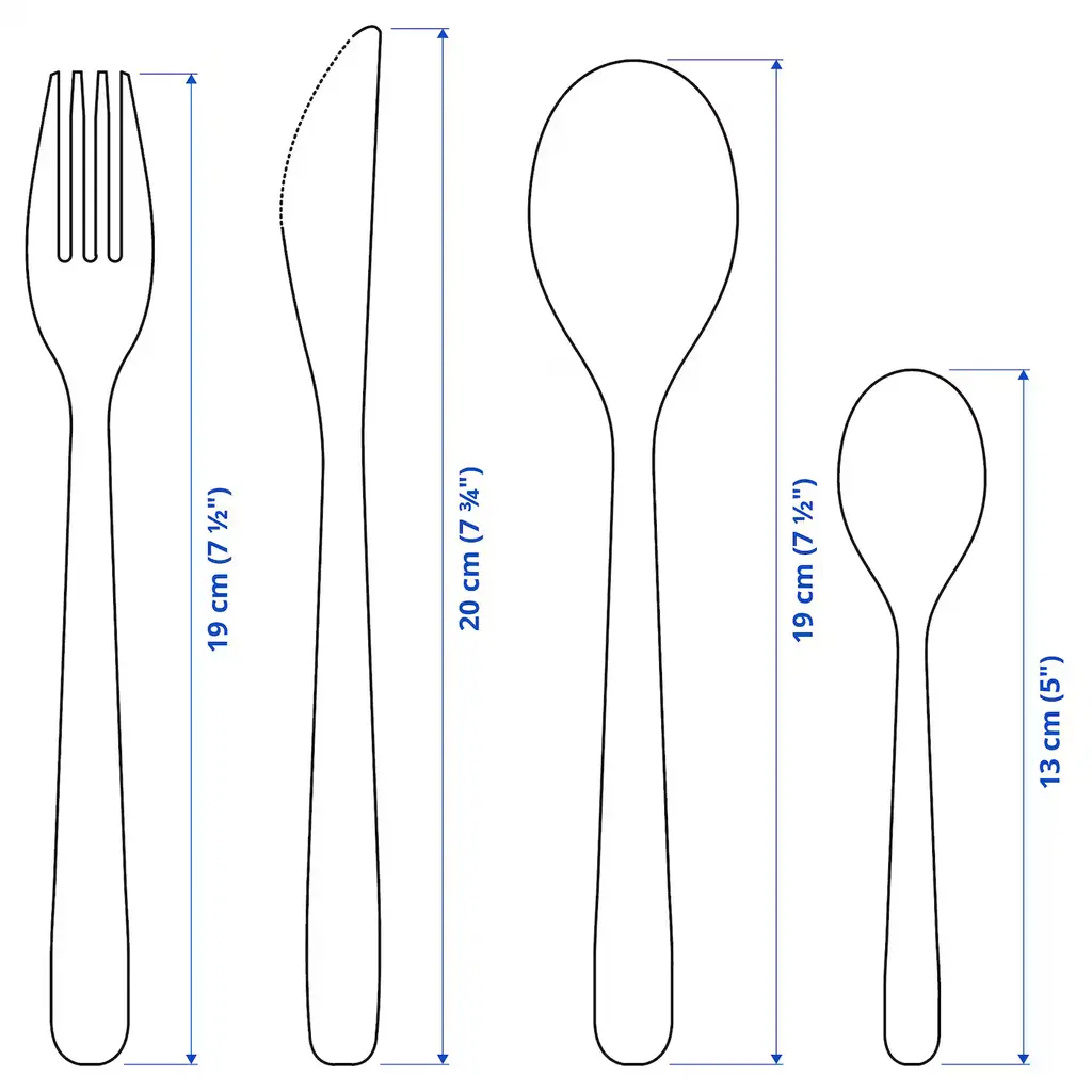 MOPSIG 16-piece flatware set. The cutlery is made of stainless steel that is durable and easy to clean. Wash this product before using it for the first time. Includes: Fork, knife, spoon and teaspoon, 4 of each.
