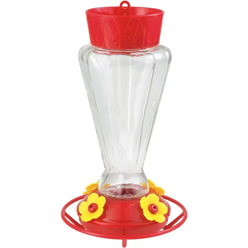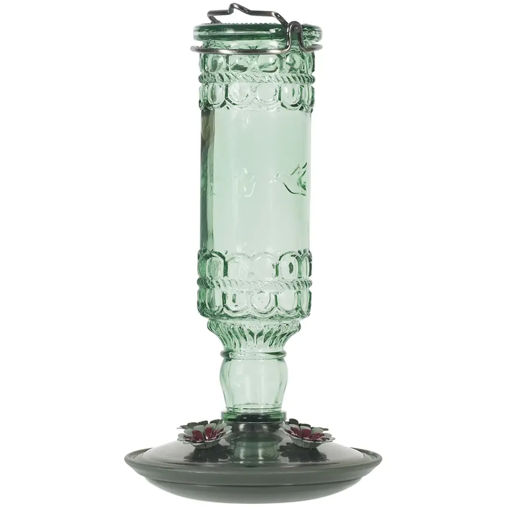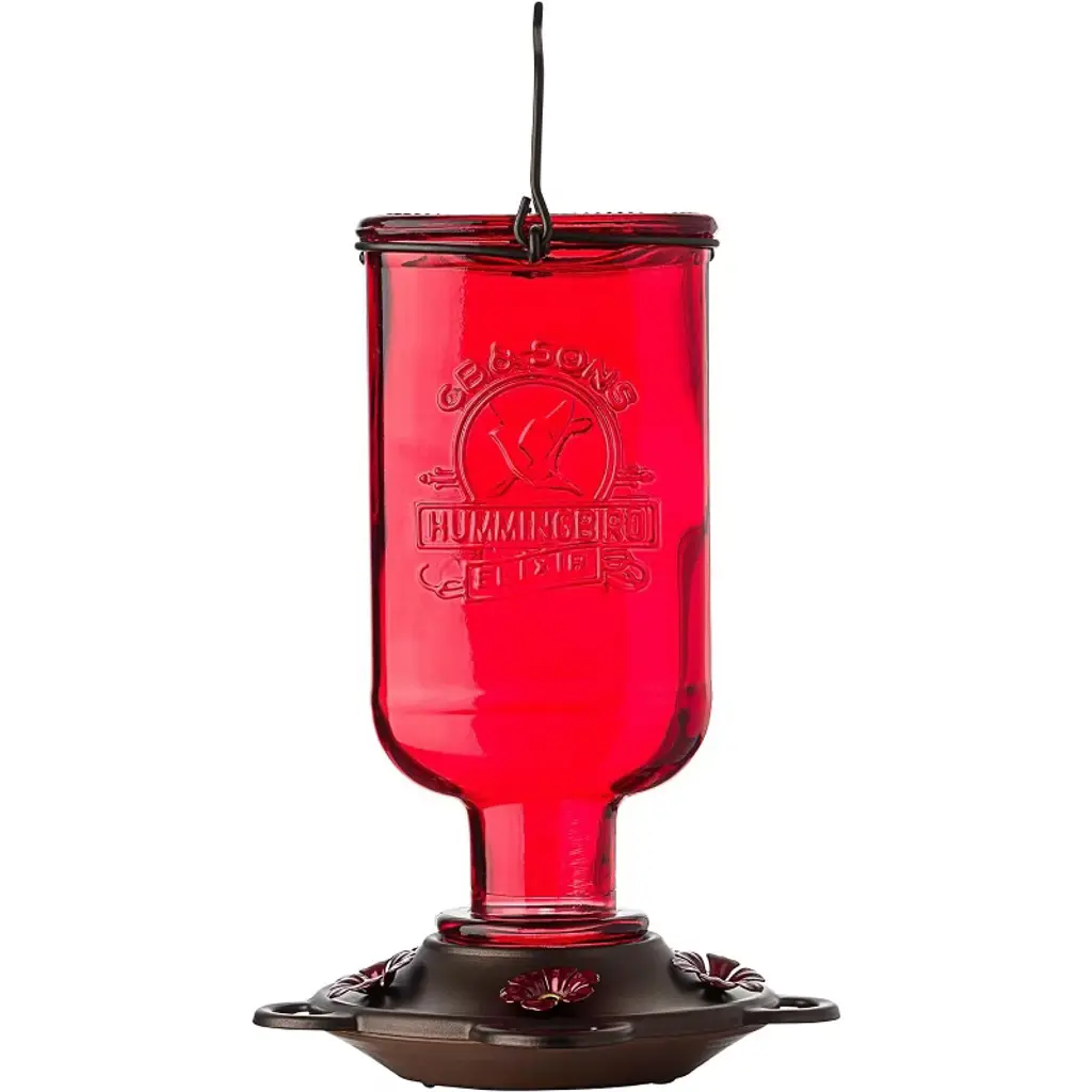 The Elixir features a richly red glass nectar bottle and a durable metal top and basin with five integrated perch feeding stations. Its beautiful burnt penny finish and antique medicine glass design give it a vintage feel that adds a splash of bygone beauty to your backyard. With a 13 ounce nectar capacity, the Elixir provides plenty of nectar to keep hummingbirds happy and coming back for more! The wide bottle opening and detachable flat base make filling easy and cleaning a breeze. When cleaning your hummingbird feeder, do not put your feeder in the dishwasher, as the high temperatures can permanently damage the feeder parts. Most expert sources discourage dishwashing because it may not fully disinfect any avian diseases.