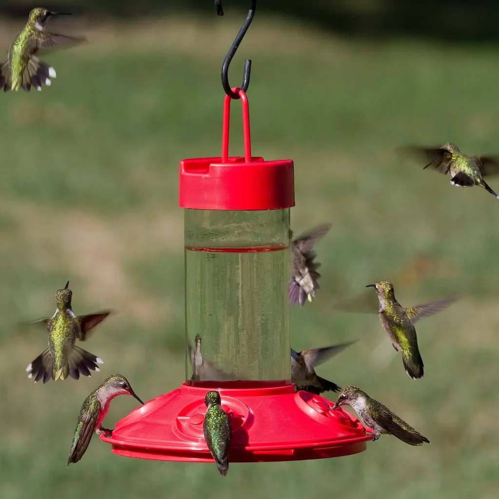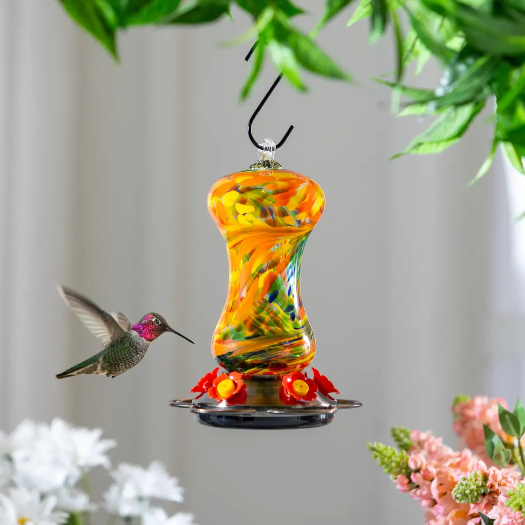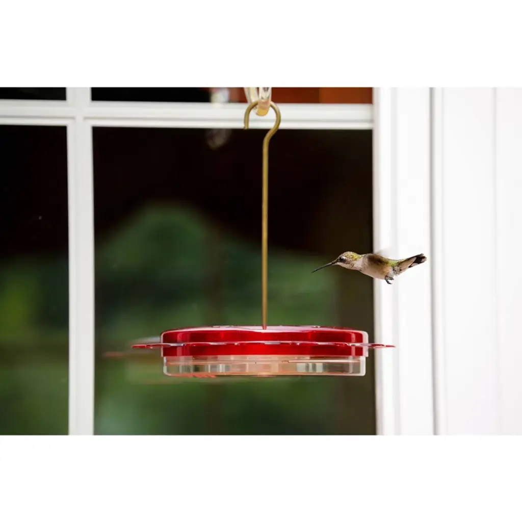The Elixir features a richly red glass nectar bottle and a durable metal top and basin with five integrated perch feeding stations. Its beautiful burnt penny finish and antique medicine glass design give it a vintage feel that adds a splash of bygone beauty to your backyard. With a 13 ounce nectar capacity, the Elixir provides plenty of nectar to keep hummingbirds happy and coming back for more! The wide bottle opening and detachable flat base make filling easy and cleaning a breeze. When cleaning your hummingbird feeder, do not put your feeder in the dishwasher, as the high temperatures can permanently damage the feeder parts. Most expert sources discourage dishwashing because it may not fully disinfect any avian diseases.