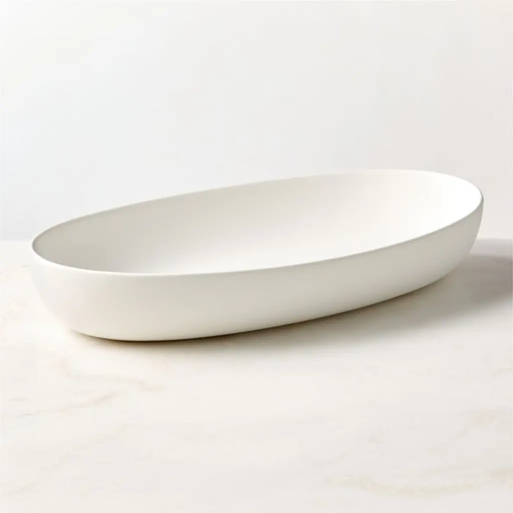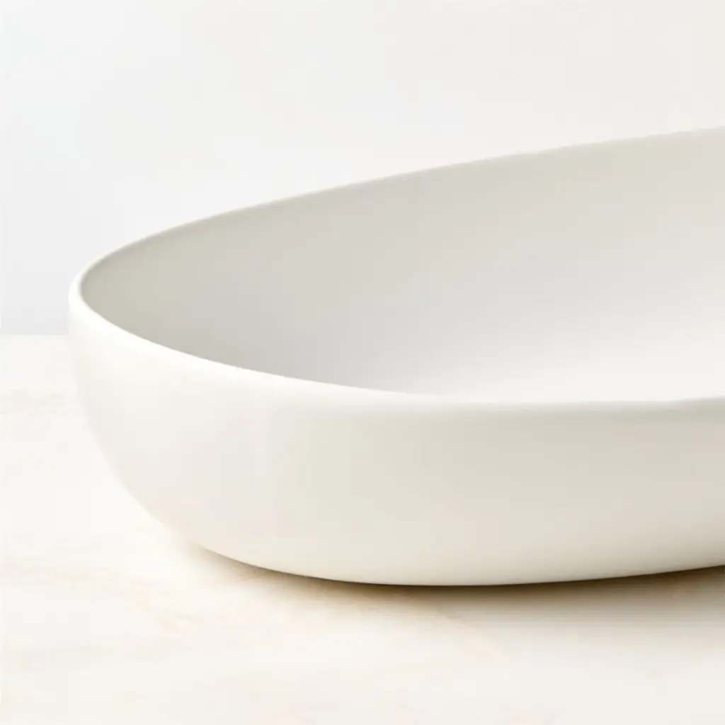 Minimalist oval serving bowl from award-winning Japanese designer Ryuichi Kozeki easily transitions from casual to formal settings. Featuring raised edges, the generous silhouette is glazed by hand in crisp matte white for an elegant finish. Provides a modern backdrop for roasted vegetables or a tartine. For a coordinated table, pair with the other pieces in the Mori dinnerware and serveware collections. CB2 exclusive.