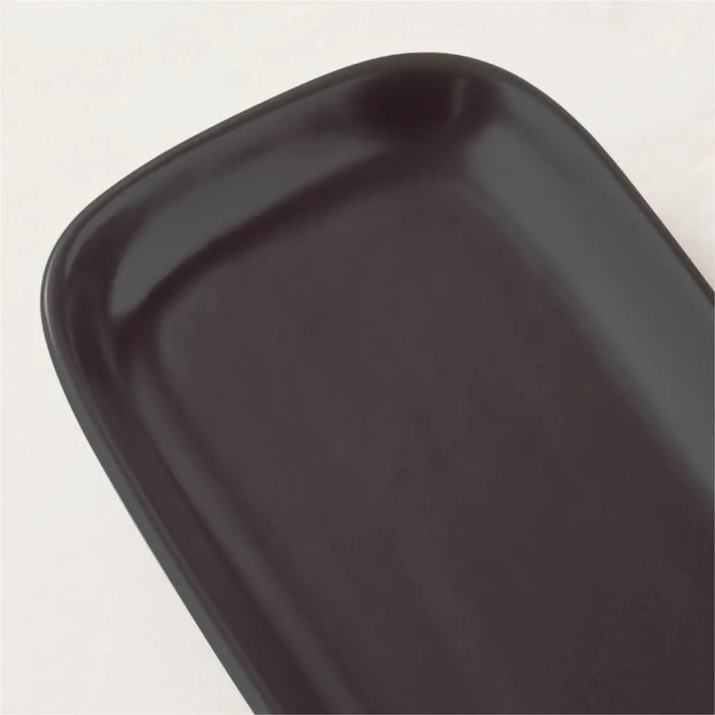 Crafted of porcelain for tradition and durability, minimalist rectangular platter from award-winning Japanese designer Ryuichi Kozeki easily transitions from casual to formal settings. Featuring raised edges, the slim silhouette is glazed by hand in sleek black for an elegant finish with a soft sheen. Provides a modern backdrop for roasted vegetables, sushi rolls or cucumber salad. For a coordinated table, pair with the other pieces in the Mori dinnerware and serveware collections. CB2 exclusive.