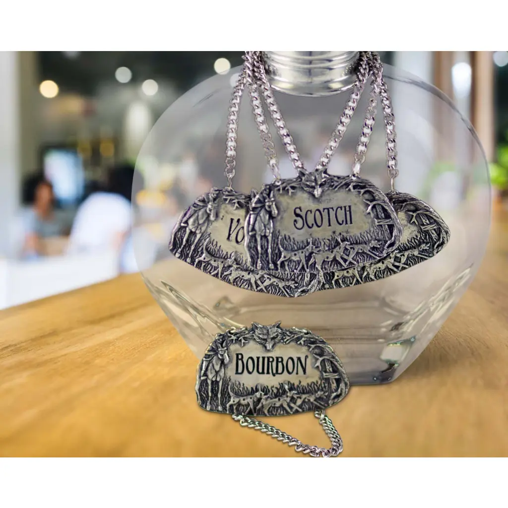 The fox, the hound, the horse and the hunter all appear in exquisitely detailed mid-relief repoussé on Vagabond House's pure pewter Morning Hunt suite of spirit decanter tags. Featuring a weighted pewter chain to ensure a perfect fit for your decanter of choice. Your choice of liquor name is center engraved in an elegant serif font, encircled by brambles, fields and the players of the hunt. Choose from the following spirits: Bourbon-Gin-Rum-Scotch-Tequila-Vodka-Whiskey Vagabond House is a family-owned American company specializing in fine pewter tableware, servingware and giftware. Largely inspired by nature, their exclusive products are designed to be unique, functional heirlooms for those who seek to express tradition and style in both family and formal entertaining.