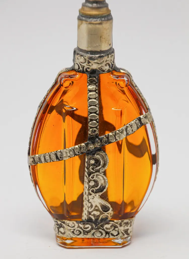 Moroccan Amber Glass Perfume Bottle With Moorish Silvered Metal Overlay