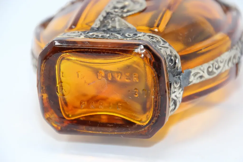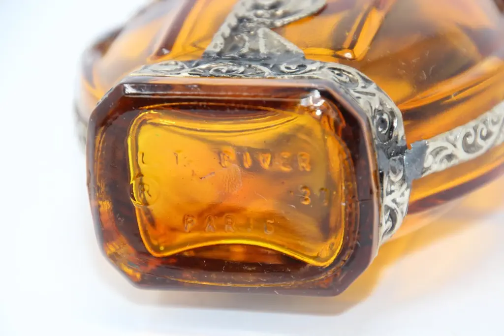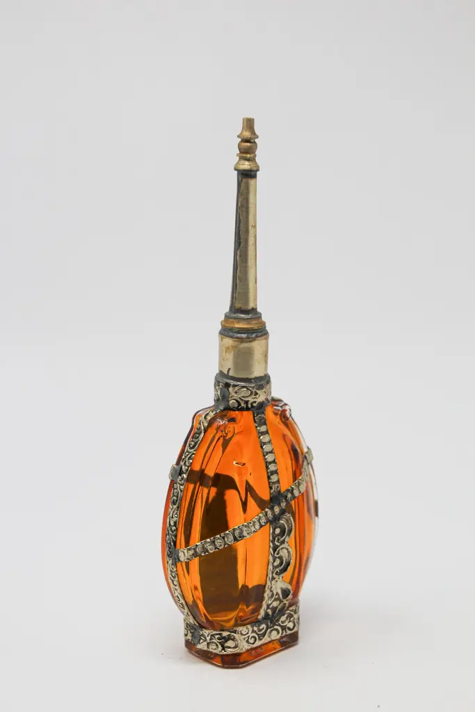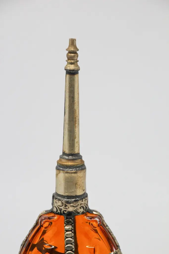 Moroccan Amber Glass Perfume Bottle with Moorish Silvered Metal Overlay – Rose Water SprinklerAn exquisite Moorish amber glass perfume bottle, also known as a rose water sprinkler, handcrafted in Morocco and richly adorned with a detailed embossed silver-toned metal overlay. The design features intricate floral and geometric motifs, reflecting the artistry of Moroccan metalwork traditions and evoking the decorative elegance of Art Deco and Art Nouveau influences.The rich amber glass body adds warmth and depth, while the tall, finely worked spout unscrews, a feature once used in traditional Moroccan hospitality rituals—sprinkling rose water as a gesture of welcome. Today, this vessel transcends its original purpose to serve as a luxury accent piece, equally at home in high-end interiors, curated collections, or as a sculptural objet d’art.Details: Origin: Morocco Marrakech Date: Mid-20th century Material: Amber glass with silvered metal overlay Style: Moorish / Moroccan / Art Deco accents Function: Perfume bottle or rose water sprinkler Condition: Excellent vintage condition, minor wear consistent with age This bottle makes an ideal designer accessory for interiors seeking Moroccan accents—whether displayed as a standalone object, styled in a luxury vignette, or grouped with other Moorish decorative arts. Its blend of authentic craftsmanship and timeless elegance makes it a rare and versatile treasure for collectors and interior designers alike.