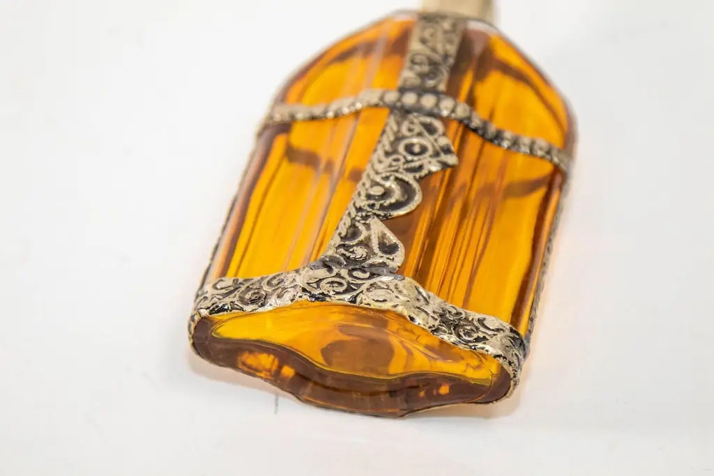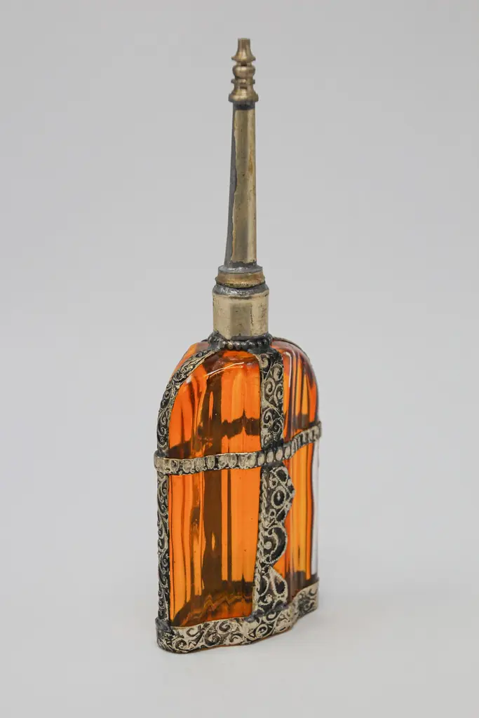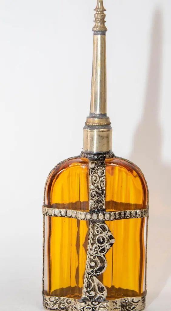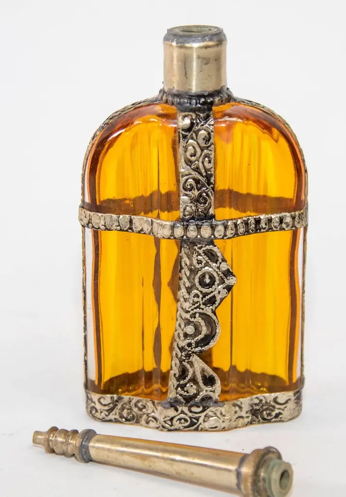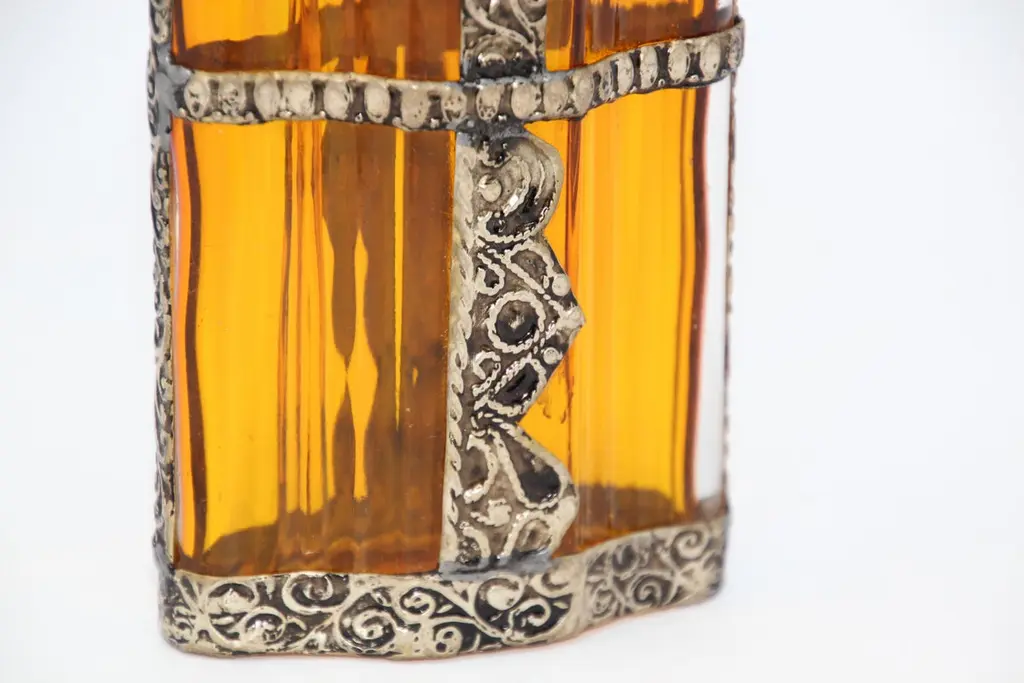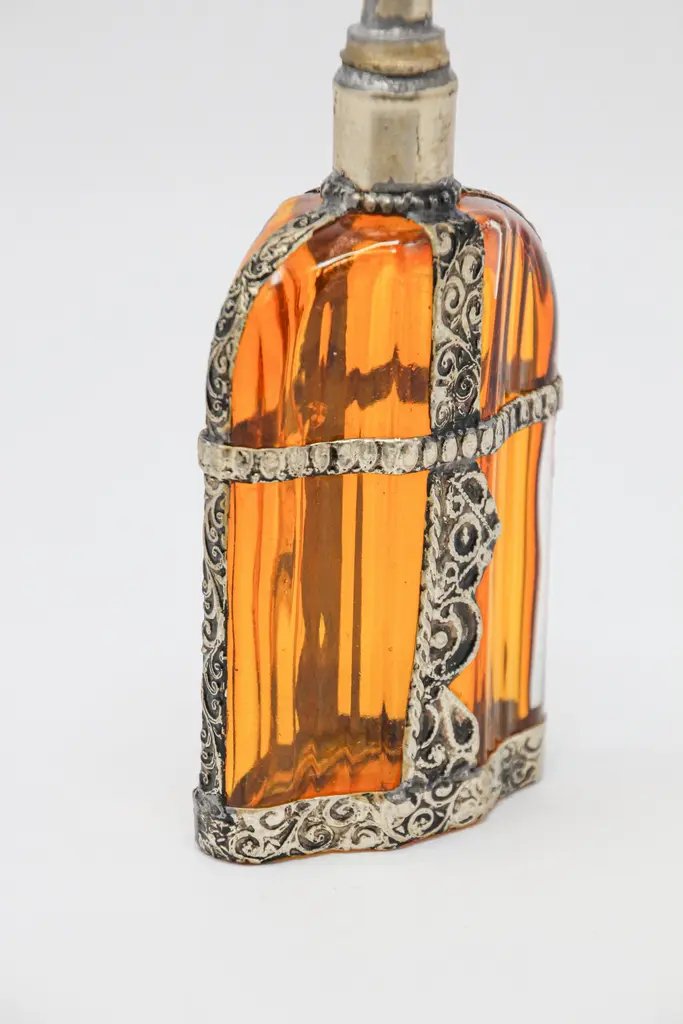 Handcrafted Moroccan Moorish amber painted glass perfume bottle or rose water sprinkler with raised embossed silvered metal floral design over amber glass.The pressed glass bottle in Art Deco, Art Nouveau style is oval shape with curved sides and hand decorated with embossed metal silvered overlay.This has a long metal top spout that unscrews.This is a recycled vintage French perfume bottle.Handcrafted in Marrakech, Morocco by skilled artisans that used recycle perfume bottle and add the metal overlay, each perfume bottle is unique and one of a kind. For decorative purpose only.Wonderful addition for a collector of Islamic Moroccan Art.