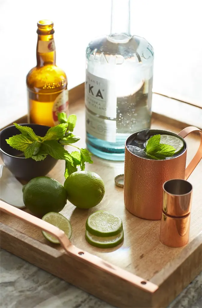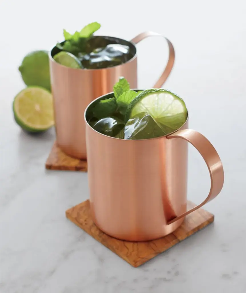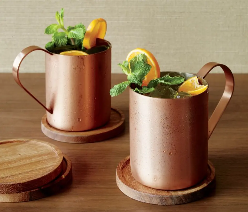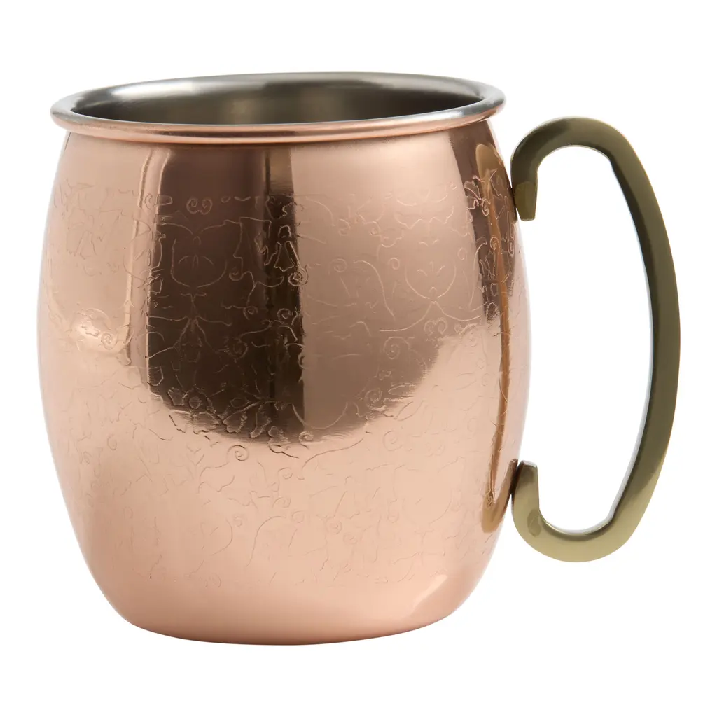 Stainless steel takes on a coppery finish as a maintenance-free alternative to the traditional copper mug used to serve the 1950s classic Moscow Mule cocktail of lime juice, vodka, ginger beer and plenty of ice. In order to keep the copper plating from tarnishing, we've applied a protective lacquer finish best protected by hand washing with mild soap.Check out our guide to making perfect cocktails at home.