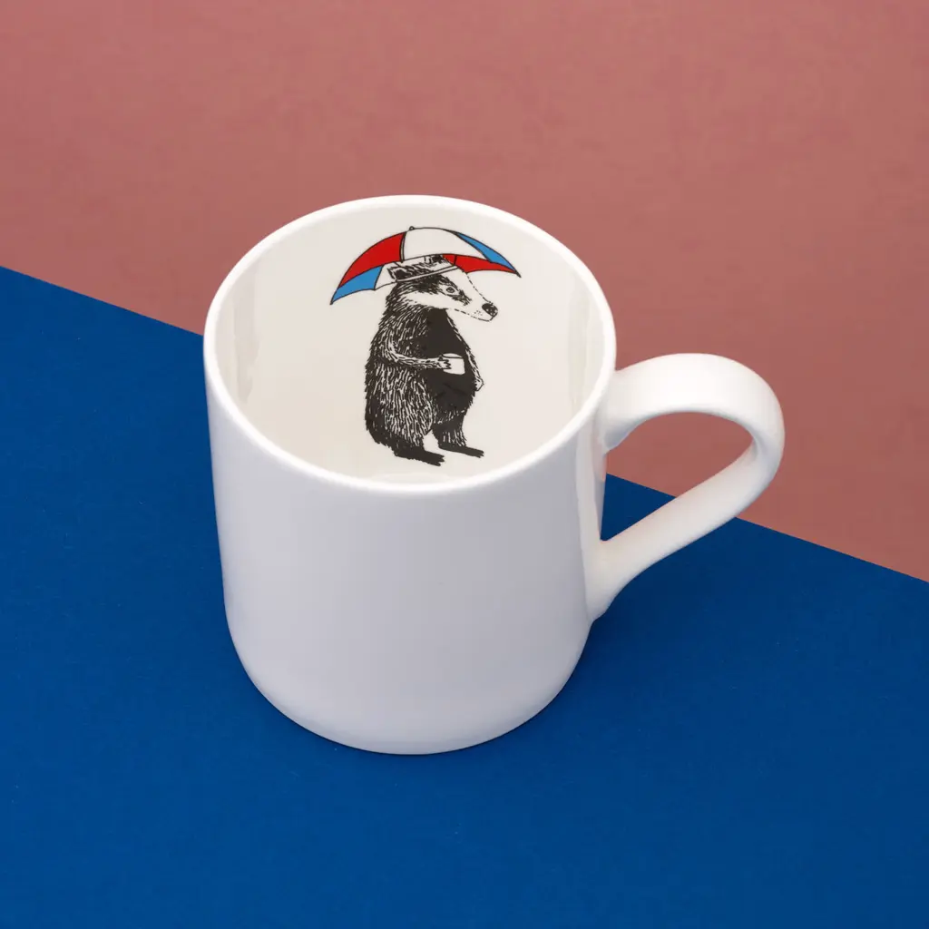 Mr. Badger hidden design is revealed as you get through your tea, coffee or hot chocolate. He's got a cuppa and umbrella hat on so he's happy! Original illustration by me and hand-decorated in the uk on a nice sized quality china mug. Material: bone chinaHand decorated in Stoke on Trent