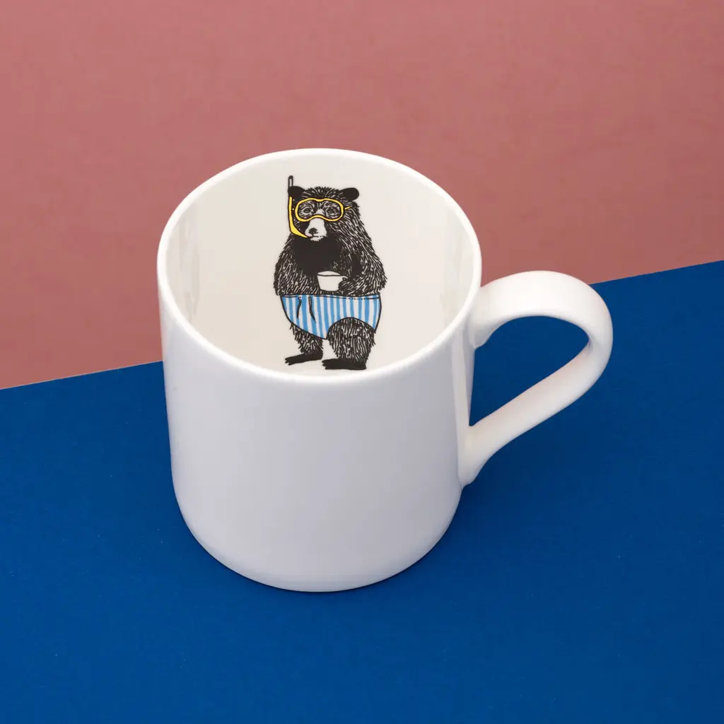 Mr. Bear hidden design is revealed as you get through your tea, coffee or hot chocolate. He's got a cuppa and his snorkelling gear on so he's prepared! Original illustration by me and hand-decorated in the U K on a nice sized quality china mug. Material: bone chinaHand decorated in Stoke on Trent
