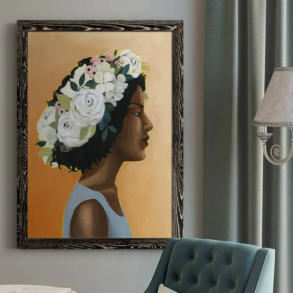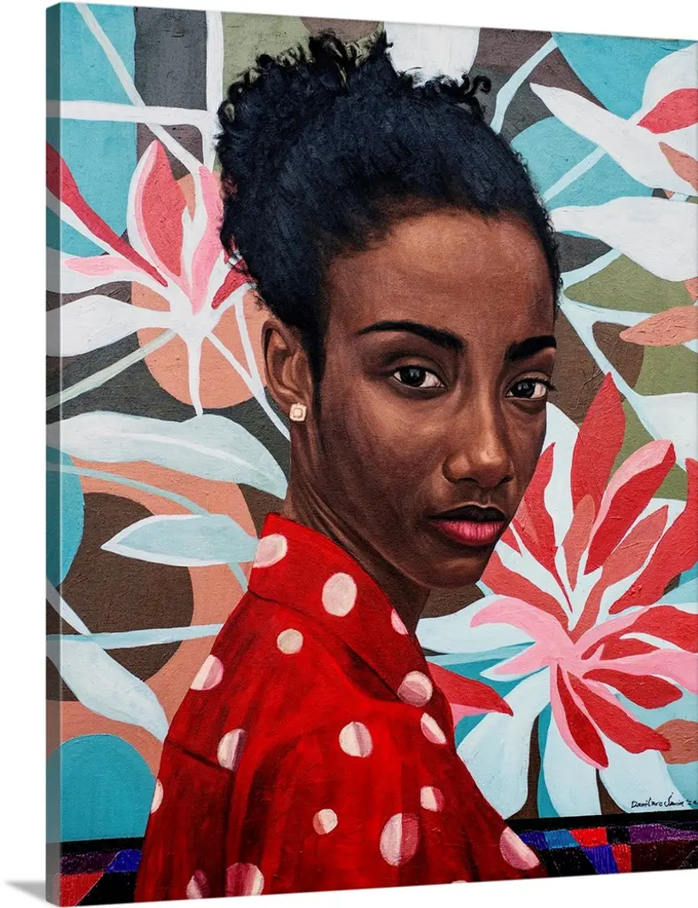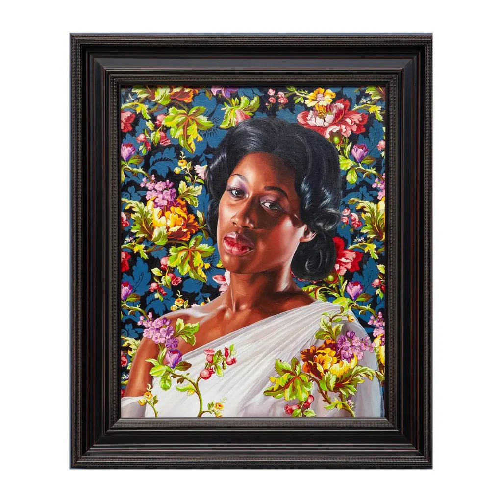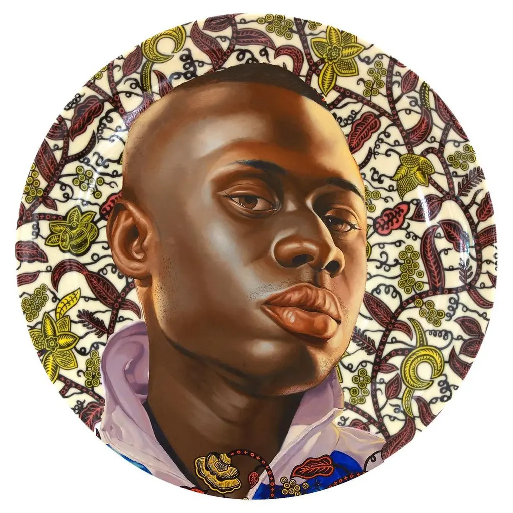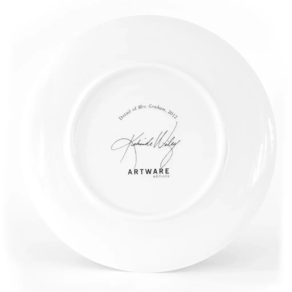 Kehinde Wiley's collection of six porcelain coupe plates is one of our best-selling editions. Made in direct collaboration with the artist, the collection features details from paintings spanning 2008-2012. Each of the six images - 3 male and 3 female - are cropped against intricate, vibrant backgrounds, and can be hung decoratively or used as completely functional dinner plates.This porcelain plate features a detail from Kehinde Wiley’s 2012 painting Mrs. Graham, reimagined from Thomas Gainsborough's The Honourable Mrs. Graham (1777). Originally exhibited at Sean Kelly Gallery in An Economy of Grace, Wiley’s model was cast from the streets of New York City.Each coupe plate is 10.75" and shows a stamped signature on the verso. The plates are individually boxed.