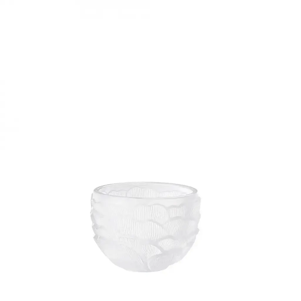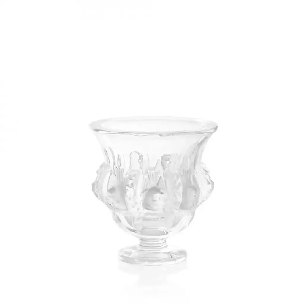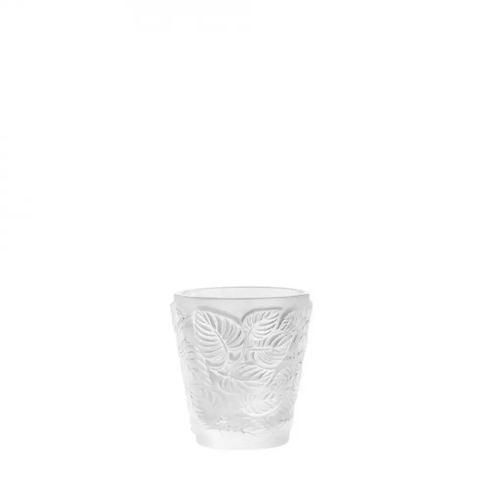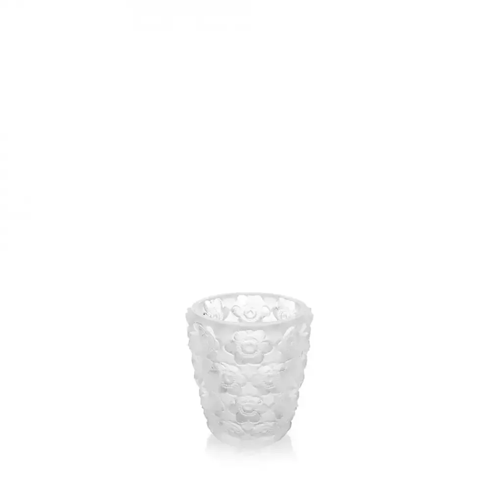 A symbol of good luck and René Lalique’s favourite flower, lily of the valley plays on accumulation on this vase and votive. The light and delicate bells are revealed behind the long undulating leaves, as if rocked by the wind. The square shape contrasts with the curved lines of the motifs illuminated by satin-finished crystal. Trained as a jeweler at the Ecole des Arts Decoratifs in Paris in the late 1880's, Rene Lalique gained recognition as an independent designer for some of the era's great jewelry houses including Cartier and Boucheron. Eventually, he turned to glassmaking, and his techniques were a triumph for the Art Deco movement. Every piece of Lalique is finely detailed and produced by hand in Alsace, France.