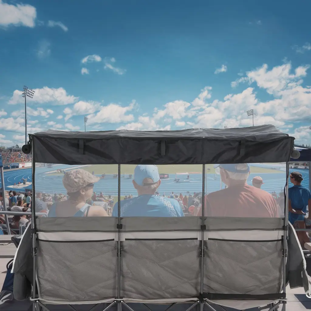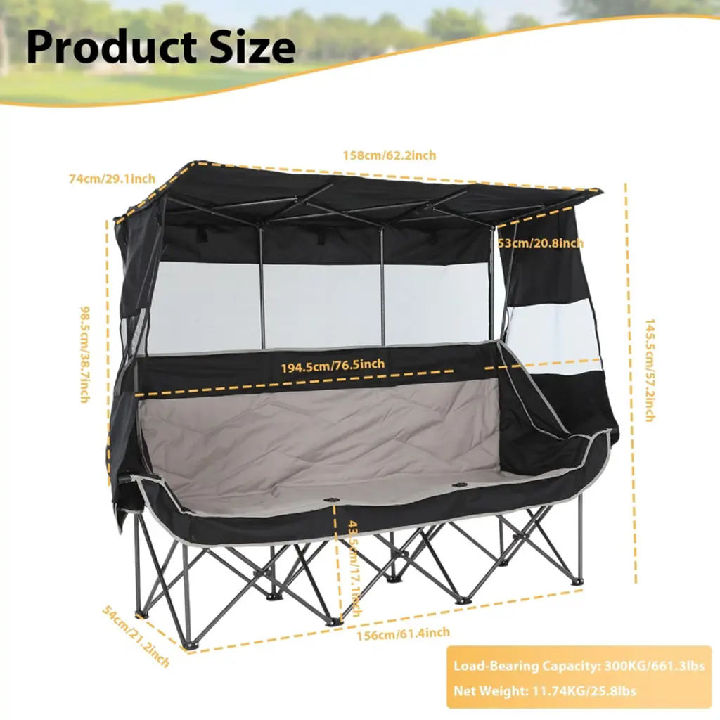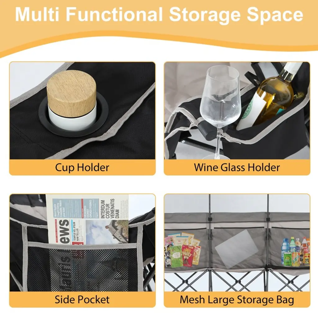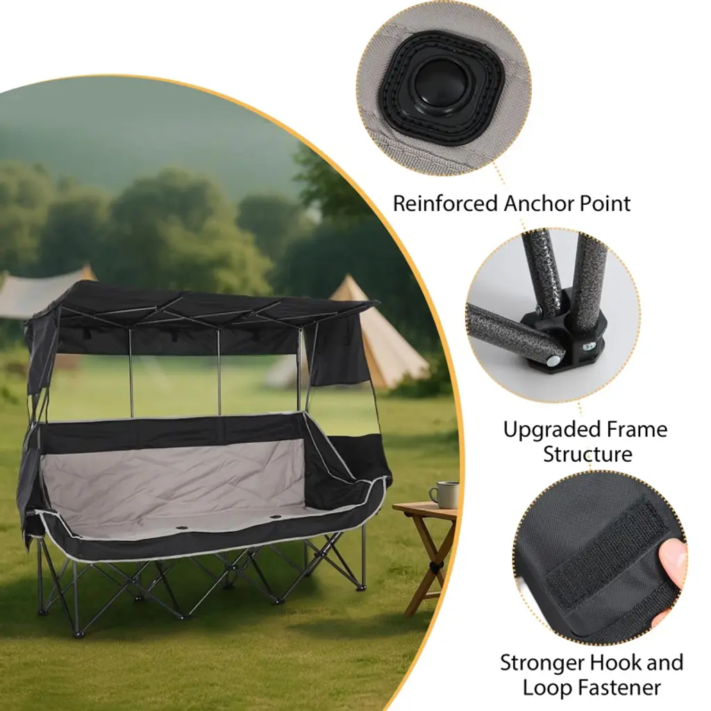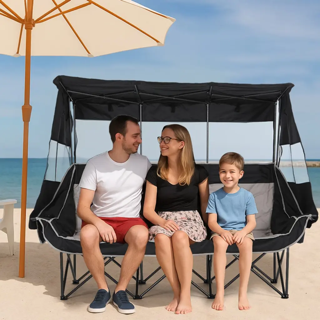 Enjoy outdoor moments together with this extra-wide 3-person camping chair, featuring a removable sun canopy, ample storage, heavy-duty support, and a foldable design for easy transport.