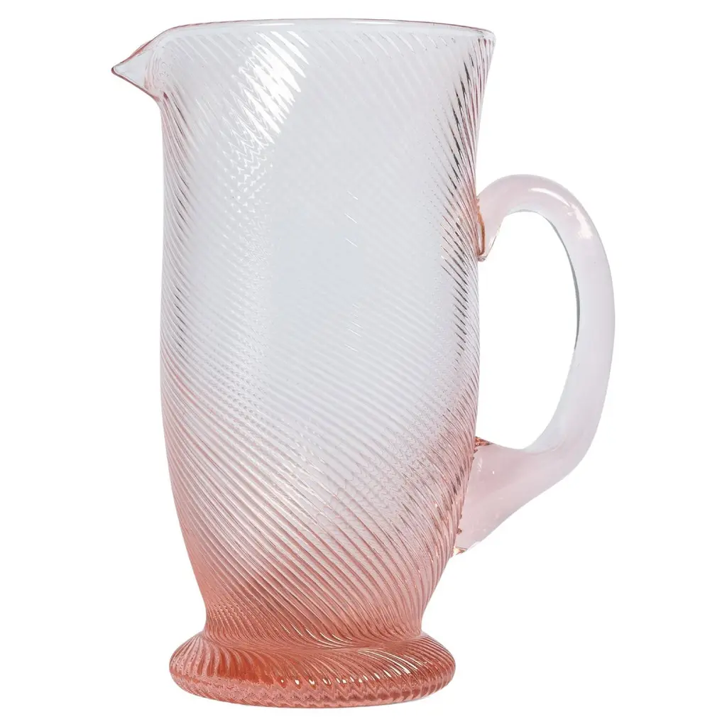 The Multicolor Pitcher is expertly crafted from transparent or colored blown glass, showcasing horizontal striped optics that add visual texture and depth. Its semi-spherical shape combines ergonomic design with aesthetic appeal, making it an ideal vessel for serving a variety of beverages with style and ease. Highlights