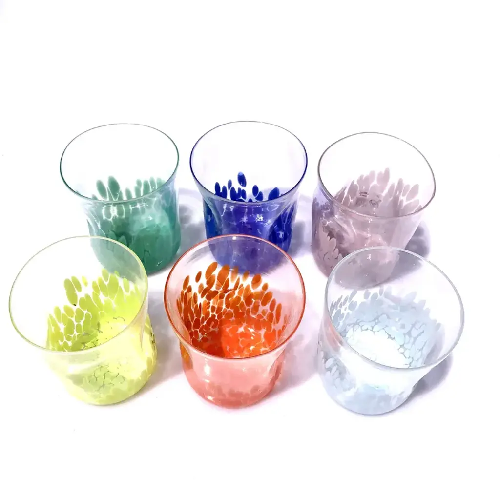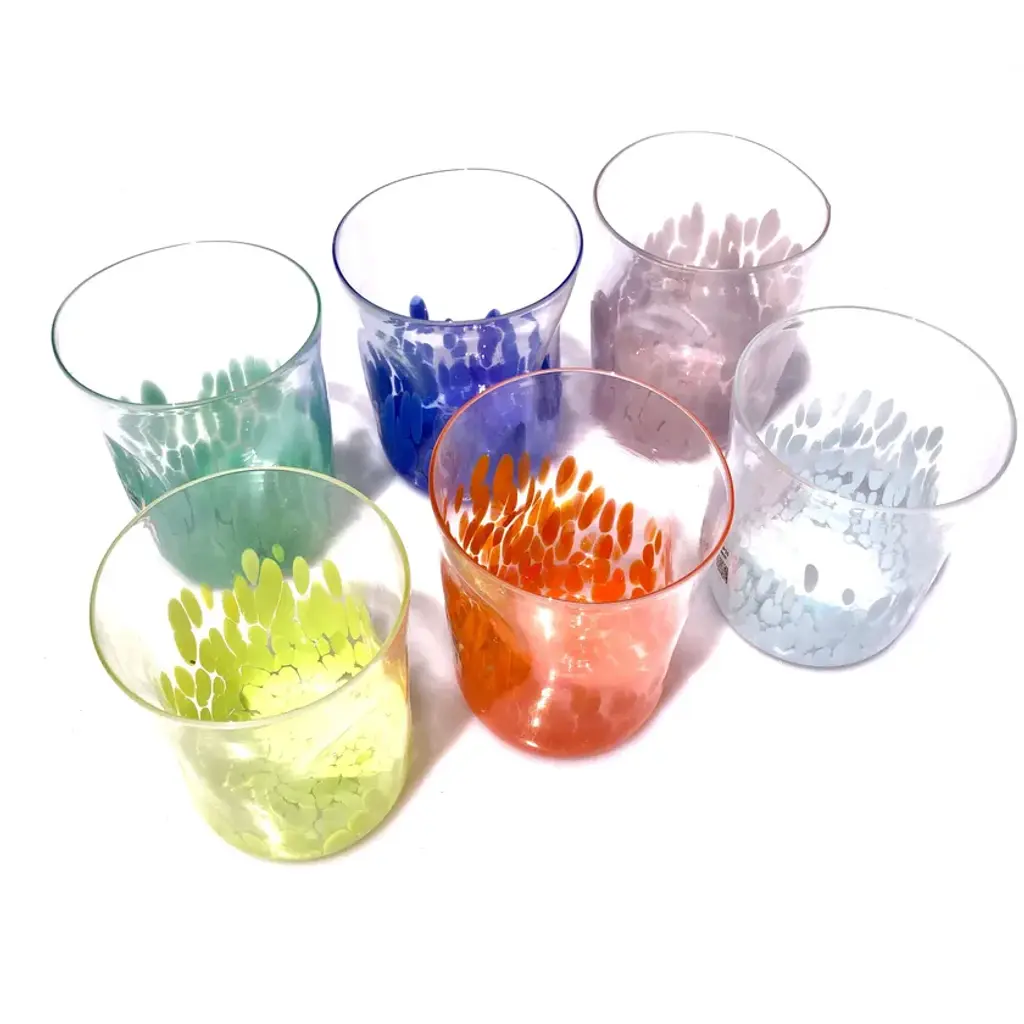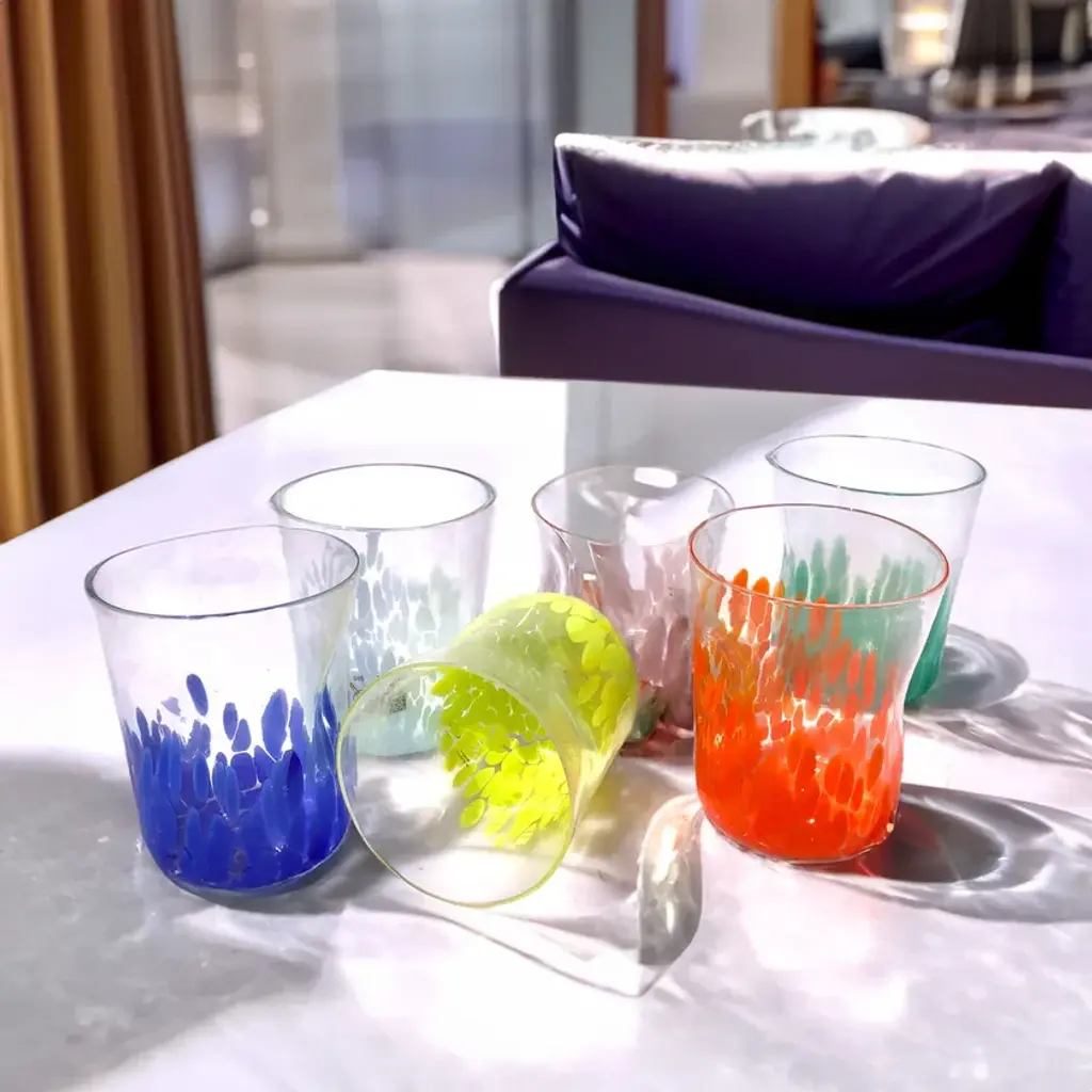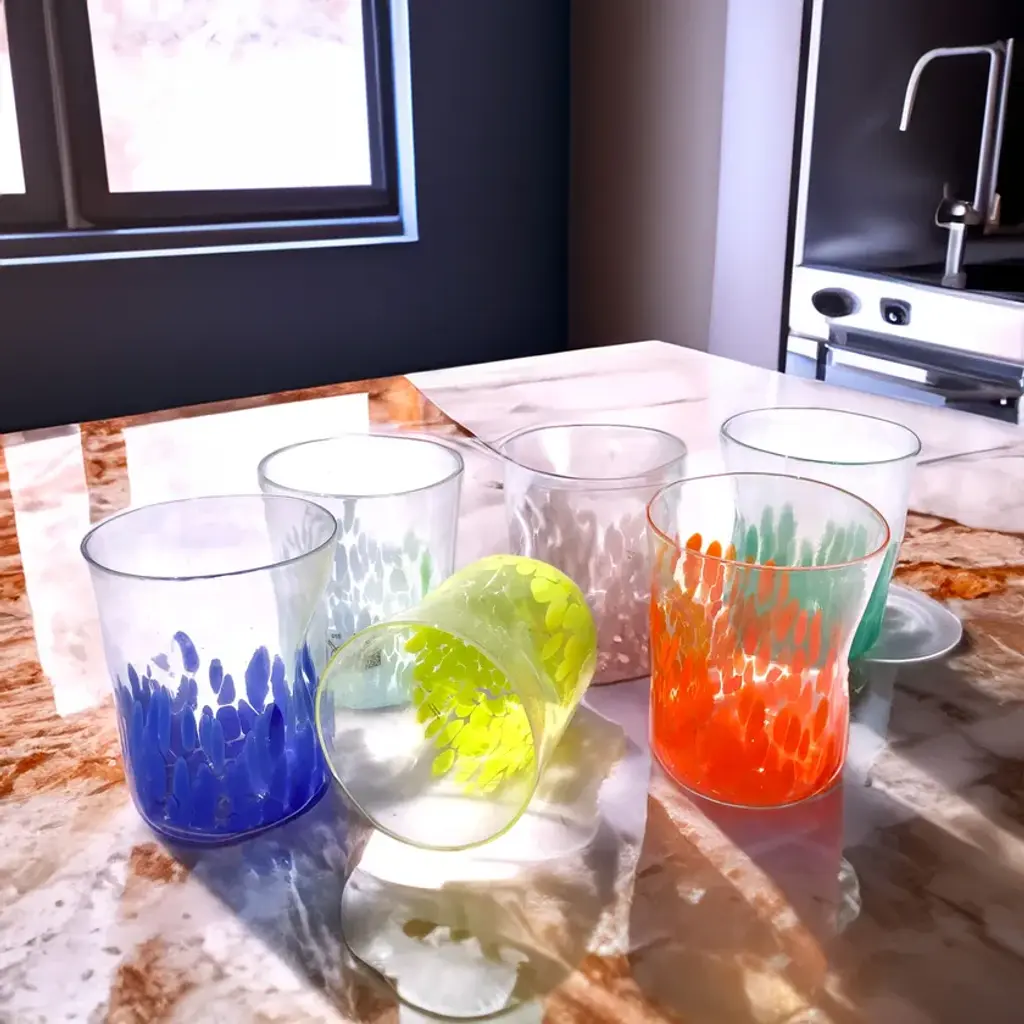 MURANO is a set of enchanting clear glasses enriched by multicolor details that rise from the bottom. Your everyday Made in Italy experience.Whether you have a classic home décor or a more modern one, whether you need colorful glasses to give a creative twist to your dining room or you are looking for a more sophisticated option to add an elegant touch to your dining table, you will certainly love our Murano glass tumblers, also known as “goti”. These precious Murano glasses are carefully handmade by expert glassmakers in the heart of the Venetian lagoon, they are unique collectible items to impress all your guests! All products are handcrafted and prime production quality. Insubstantial variations in shape, size, colour, small imperfections in the glass are not considered defects; they are inevitable and are typical of manual production of the glass and characterize handcrafted production.