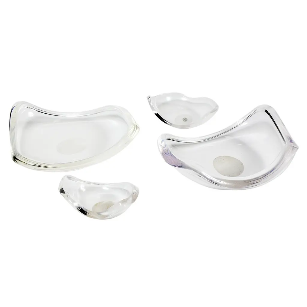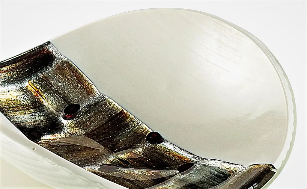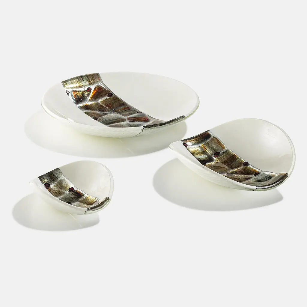 This set of 3 centerpieces is made with an aventurine glass central insert and silver leaf on an ivory base. Plate measurements: 30 cm, medium oval 24x19 cm, small oval 15x12 cm. Signed by Maker,Labeled by Maker,Signed by Maker,Labeled by Maker