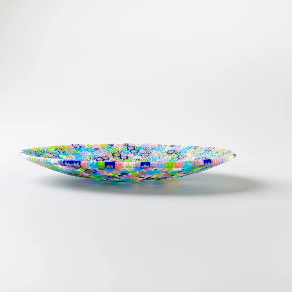 Murano glass plate made by melting together sections of glass rods in a furnace, with each section depicting a small decorative motif. This technique is called “Millefiori Murrina Glass”. A murrina with the initial “M” for Moretti is inserted during the composition. Each plate is marked with the “Vetri Artistico Murano” brand that certifies its origin. Sold with gift box. Signed by Maker