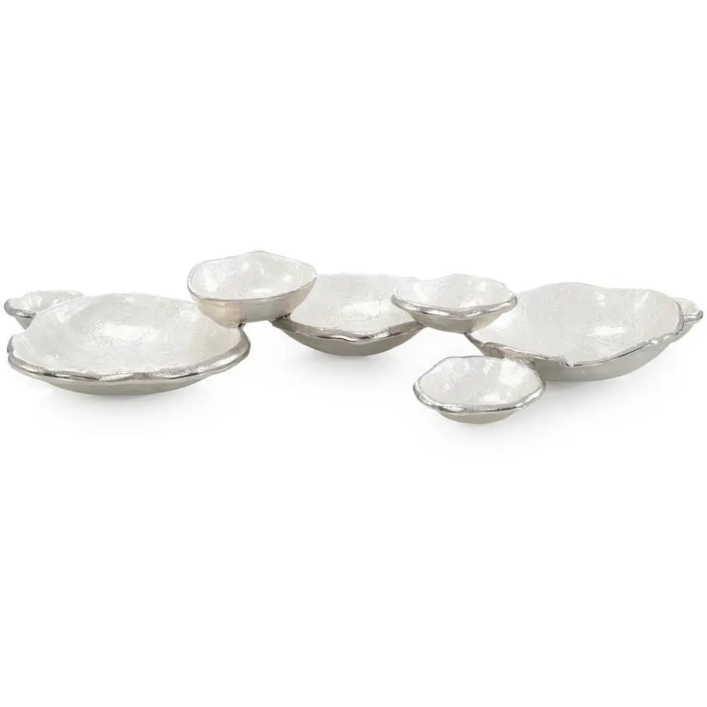 This set of three plates is made with a central aventurine glass insert and a silver leaf on a Venetian red base. The plates measure:30 cm, medium oval 24x19 cm, small oval 15x12 cm. Signed by Maker,Labeled by Maker,Signed by Maker,Labeled by Maker