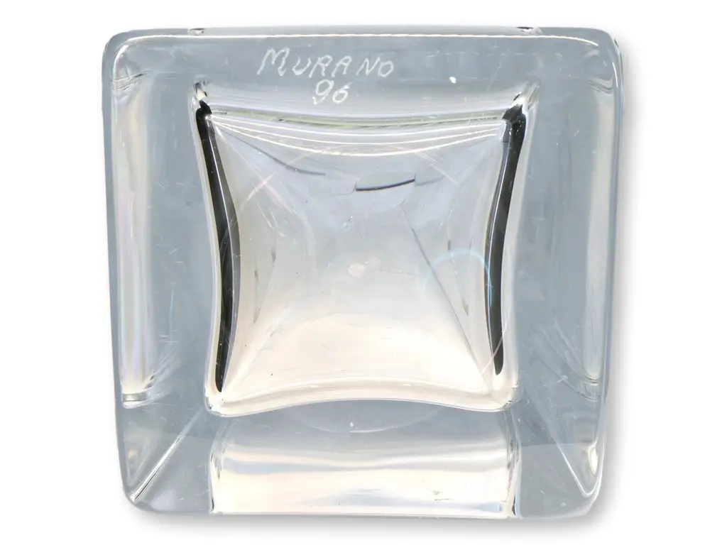 Modernist Murano glass decanter signed and dated “Murano 96.” Features a faceted ball stopper and bold pyramid silhouette in thick, clear Italian glass. Sculptural and functional. Excellent clarity with light shelf wear to base.