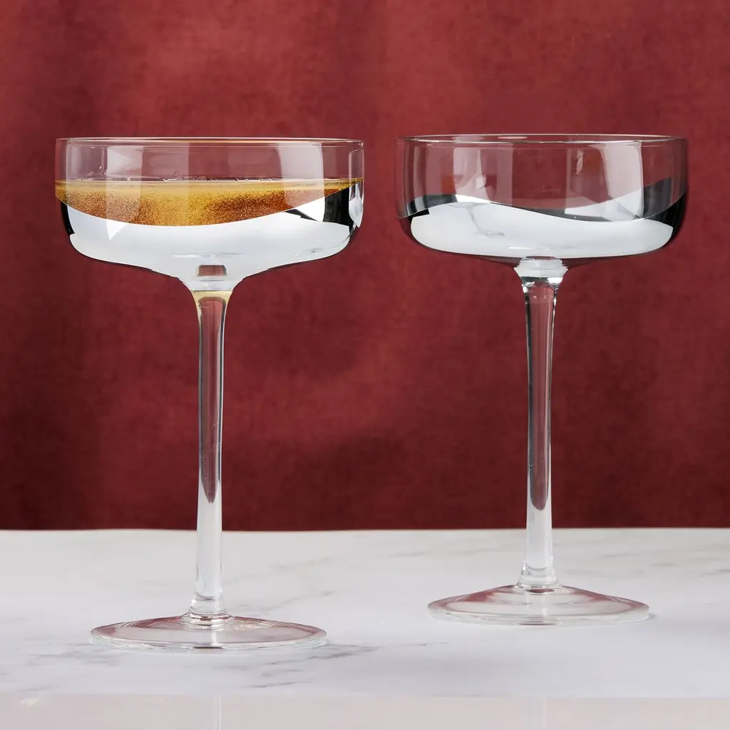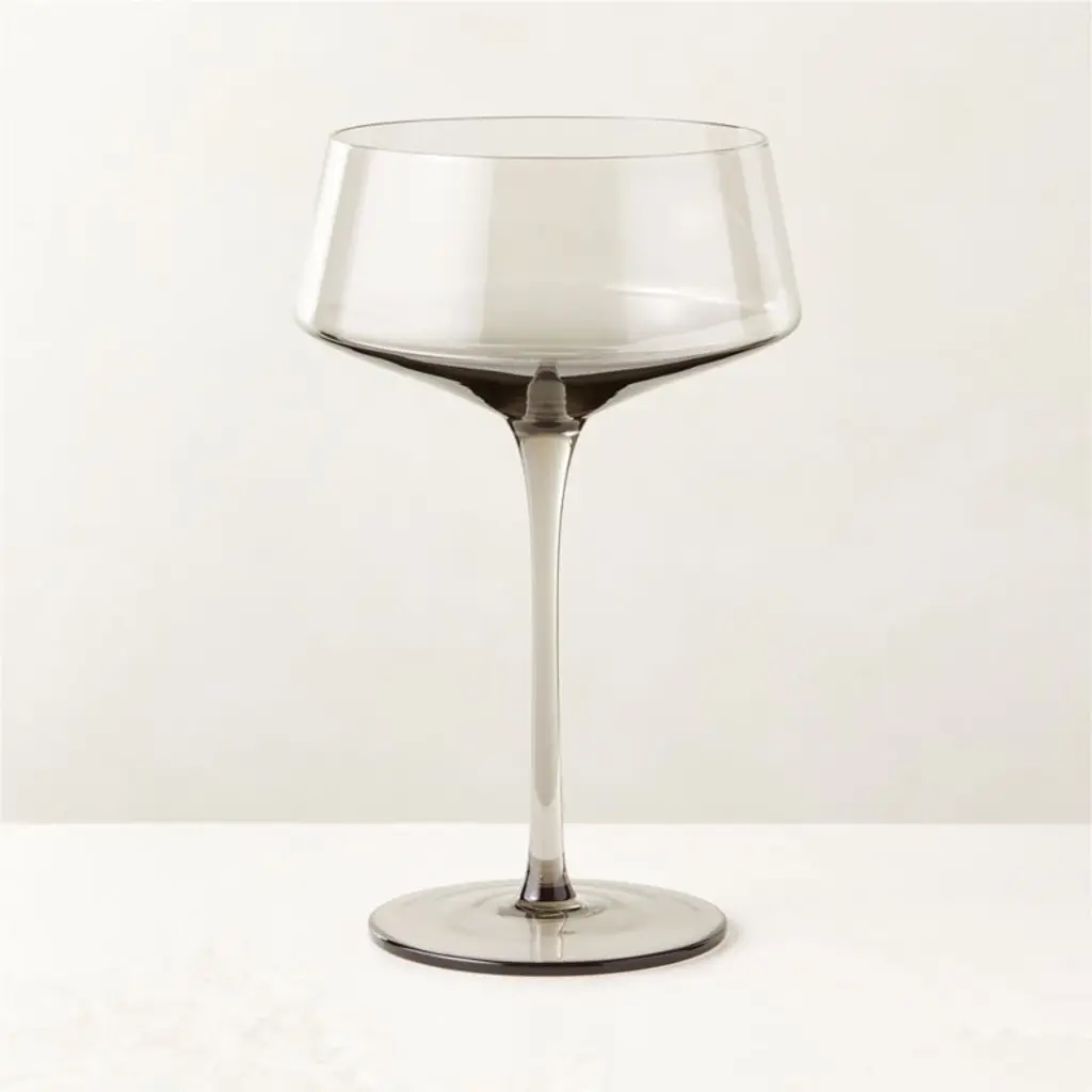 Handmade by skilled artisans, our best-selling Muse coupe glass brings modern lines and an unexpected smoke color to cocktail hour. The smoked crystalline glass features a long, delicate stem and tapered bowl for a dramatic update on the classic silhouette. Pair with the other glasses in the Muse stemware collection. CB2 exclusive.