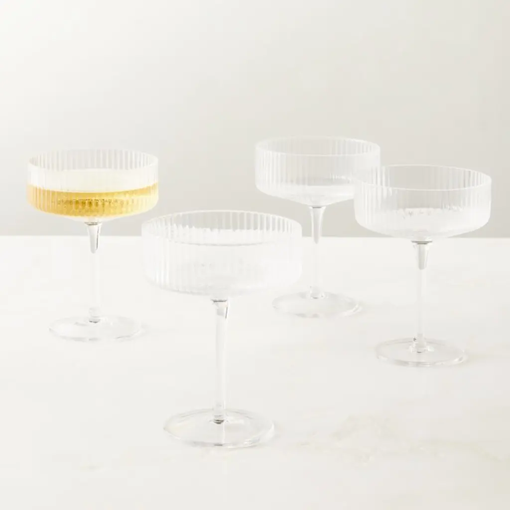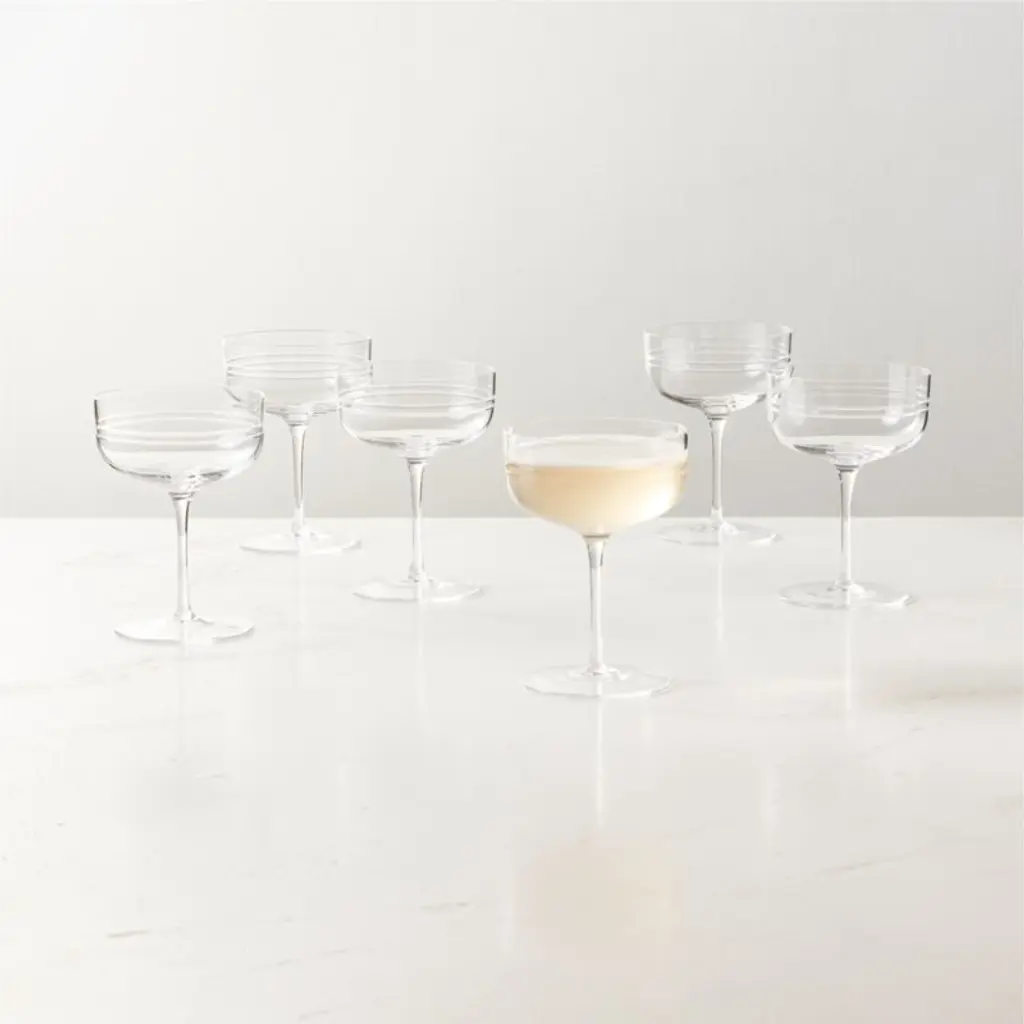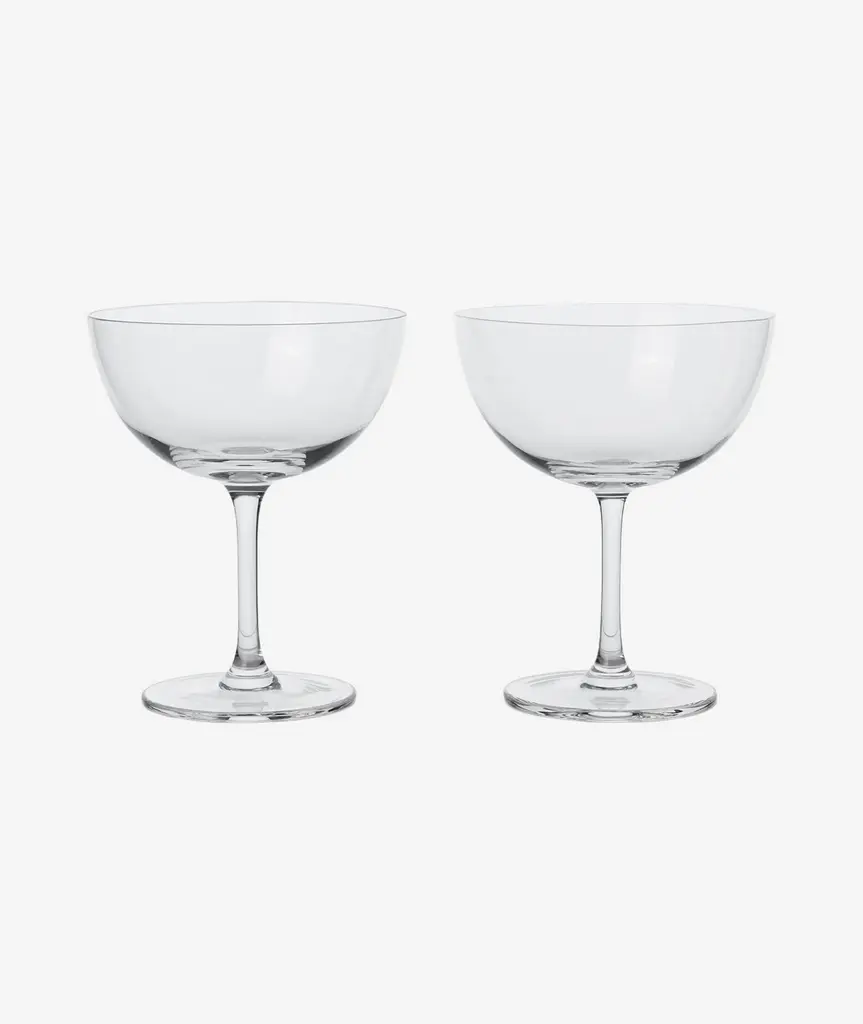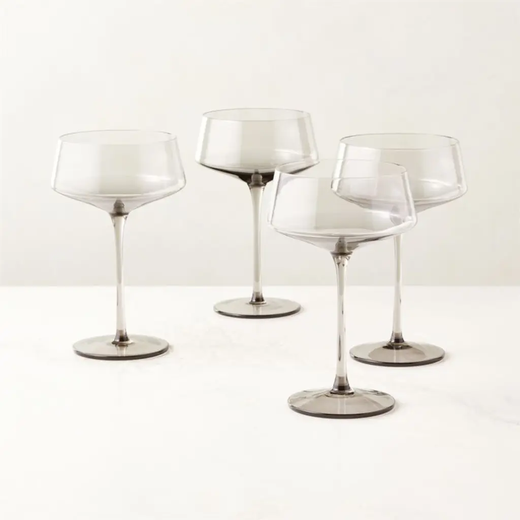 Handmade by skilled artisans, our best-selling Muse coupe glasses bring modern lines and an unexpected smoke color to cocktail hour. The smoked crystalline glasses feature a long, delicate stem and tapered bowl for a dramatic update on the classic silhouette. Pair with the other glasses in the Muse stemware collection. CB2 exclusive.