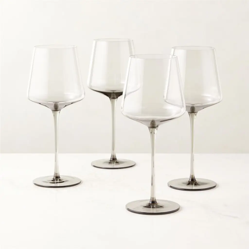 Handmade by skilled artisans, our best-selling Muse red wine glasses bring modern lines and an unexpected smoke color to a classic silhouette. The smoked crystalline glasses feature a long, delicate stem and tapered bowl to promote aeration and enhance the flavor of the wine. Pair with the other glasses in the Muse stemware collection. CB2 exclusive.