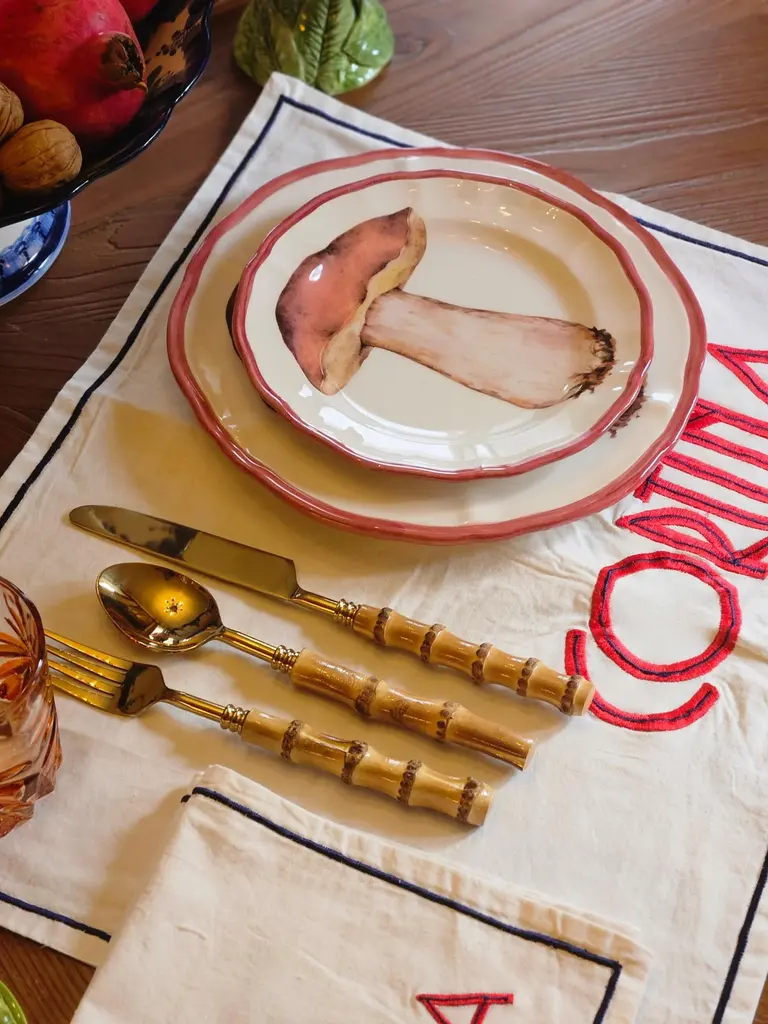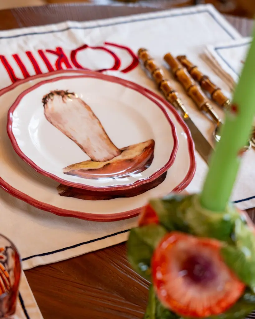 Embrace the warmth of autumn with our ceramic plate from the Mushroom collection. Featuring a delicately hand-painted border and a hand-applied decal of a mushroom design, this plate brings the beauty of the season to your table or wall decor. Perfect for adding a touch of nature-inspired charm to your dining experience or as an artistic accent piece for your home, it’s a celebration of craftsmanship and the magic of fall.