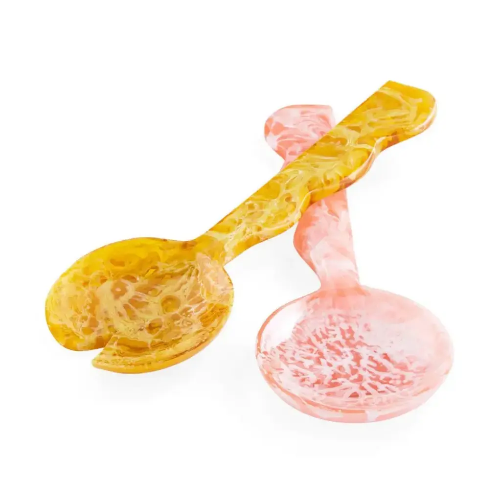 Our mesmerizing Mustique collection pairs juicy, dimensional color with bold, Memphis-y geometrics. Hand-poured to create a unique marbleized finish, each piece is then polished to luminous perfection. Our Mustique serving set features swirling poppy tones and our signature ripple edge. One-of-a-kind shine that plays well with both minimalist and maximalist table settings. Set of two utensils.