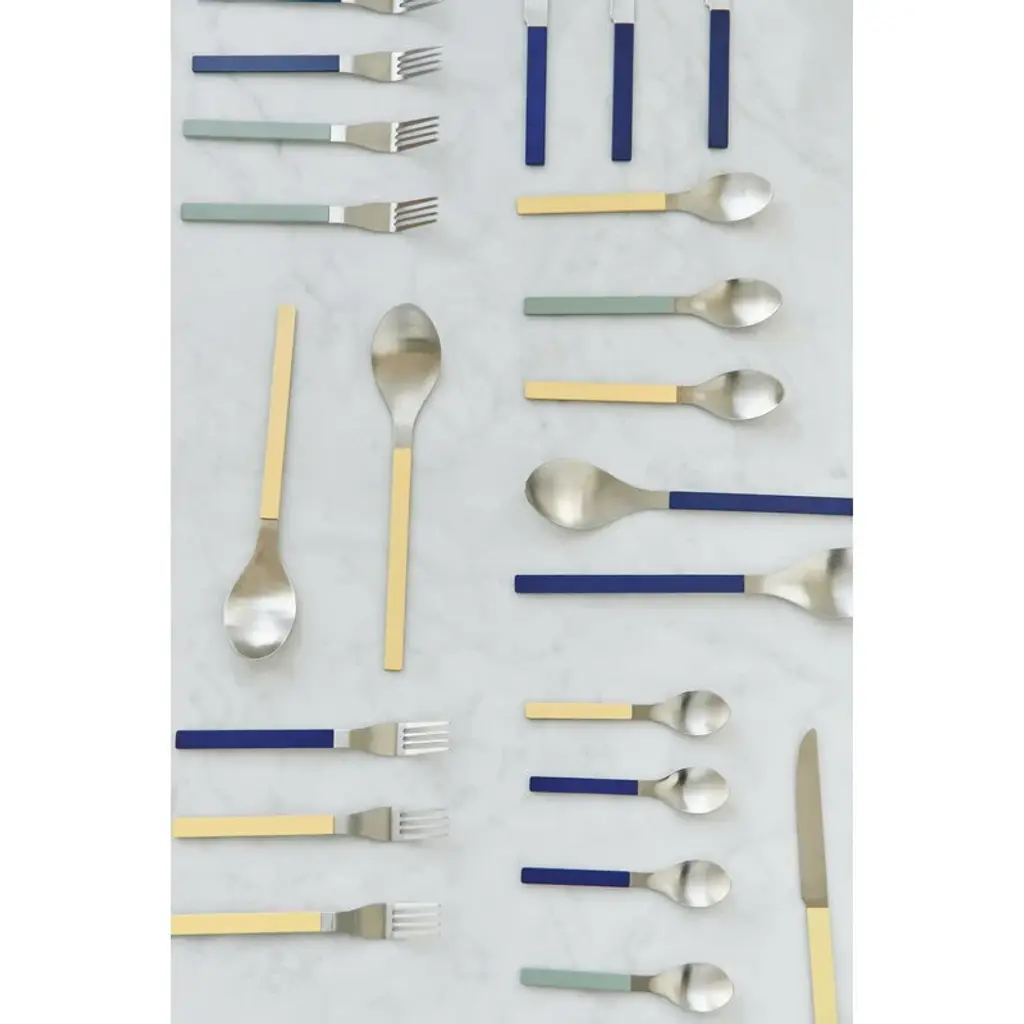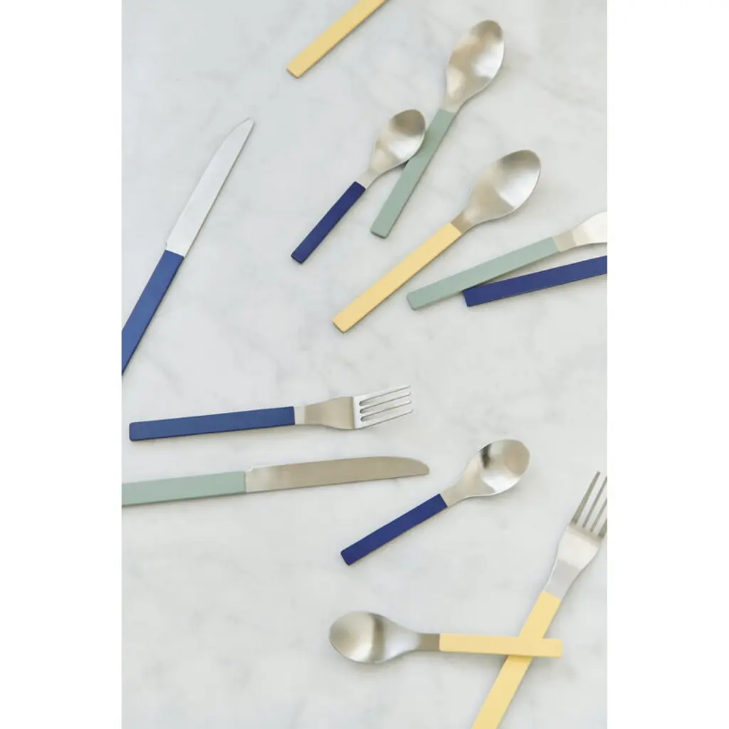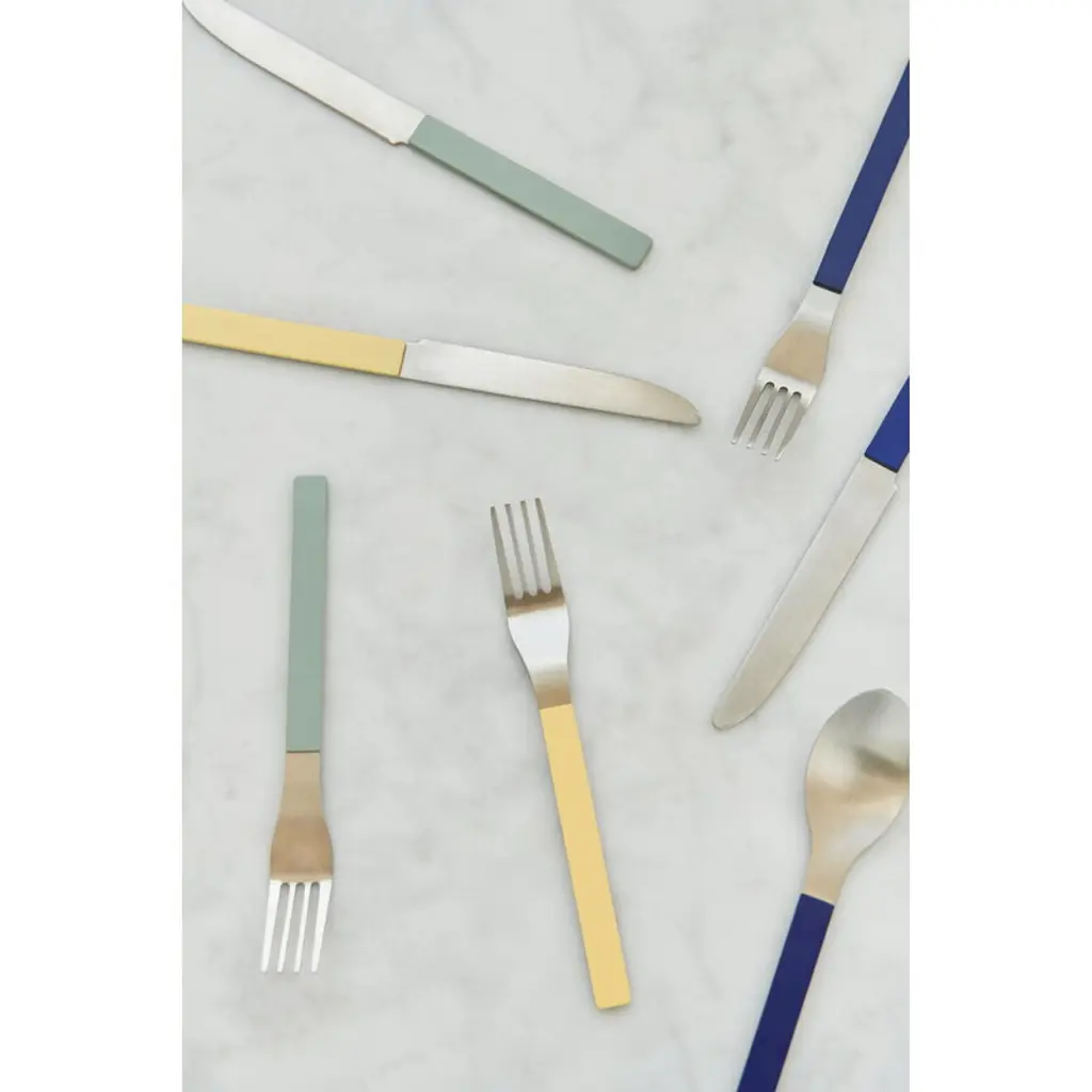 HAY's MVS set presents a whimsical interpretation of traditional cutlery. Designed by Muller Van Severen, the cutlery set serves as a delightful brightener for day-to-day meals, but offers color and shades for more festive feasts, as well. Made of brushed stainless steel, the MVS set includes four pieces of cutlery: one fork, one tablespoon, one knife and one teaspoon.