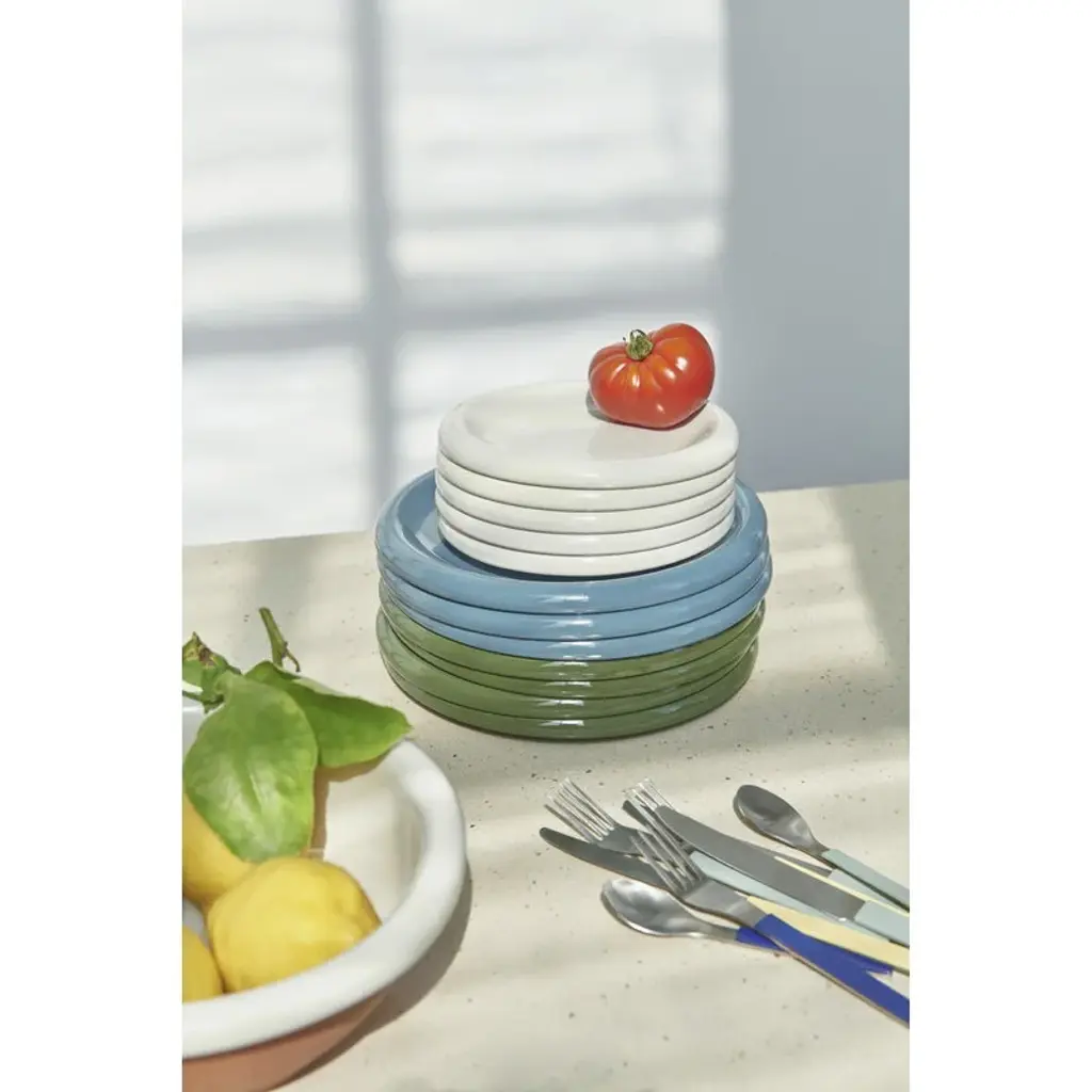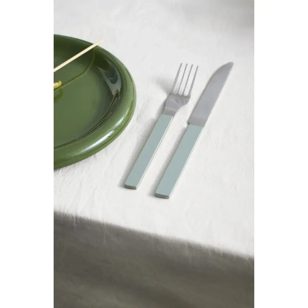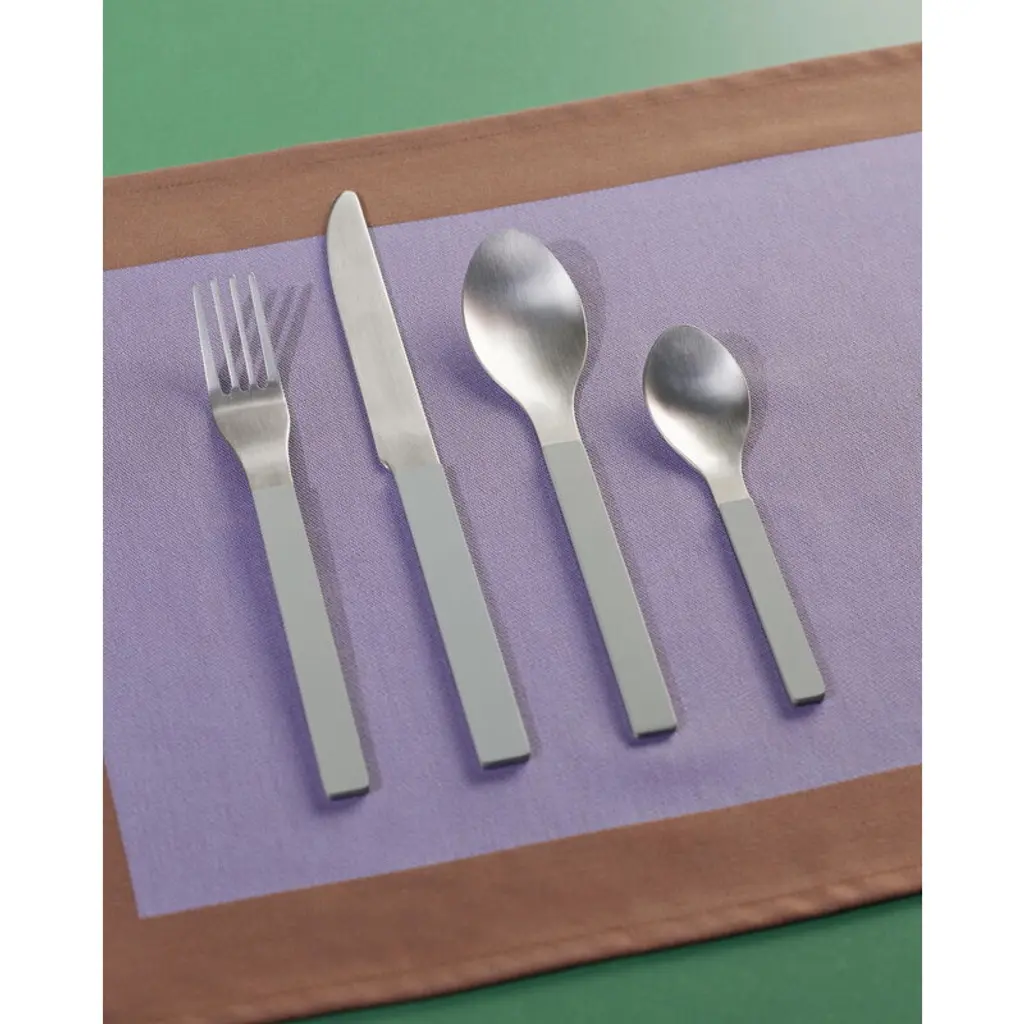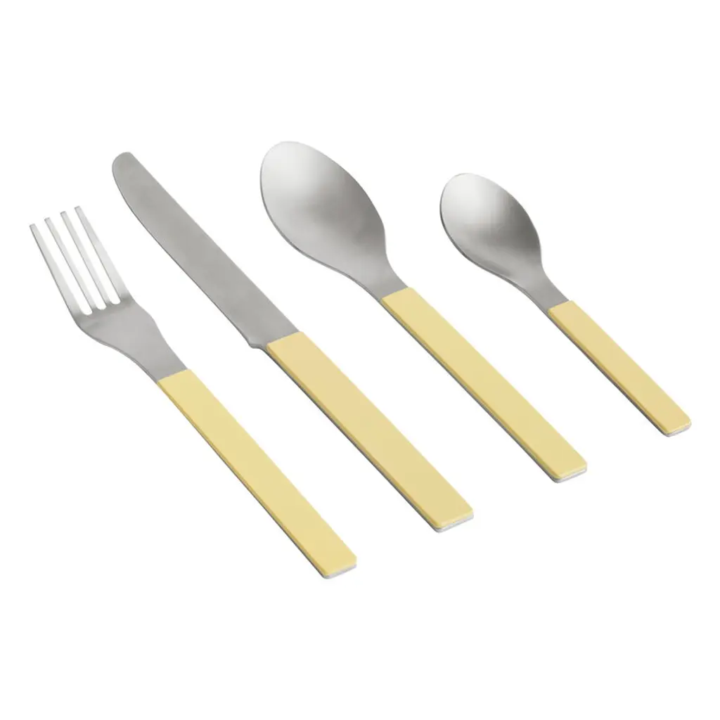 HAY's MVS set presents a whimsical interpretation of traditional cutlery. Designed by Muller Van Severen, the cutlery set serves as a delightful brightener for day-to-day meals, but offers color and shades for more festive feasts, as well. Made of brushed stainless steel, the MVS set includes four pieces of cutlery: one fork, one tablespoon, one knife and one teaspoon.