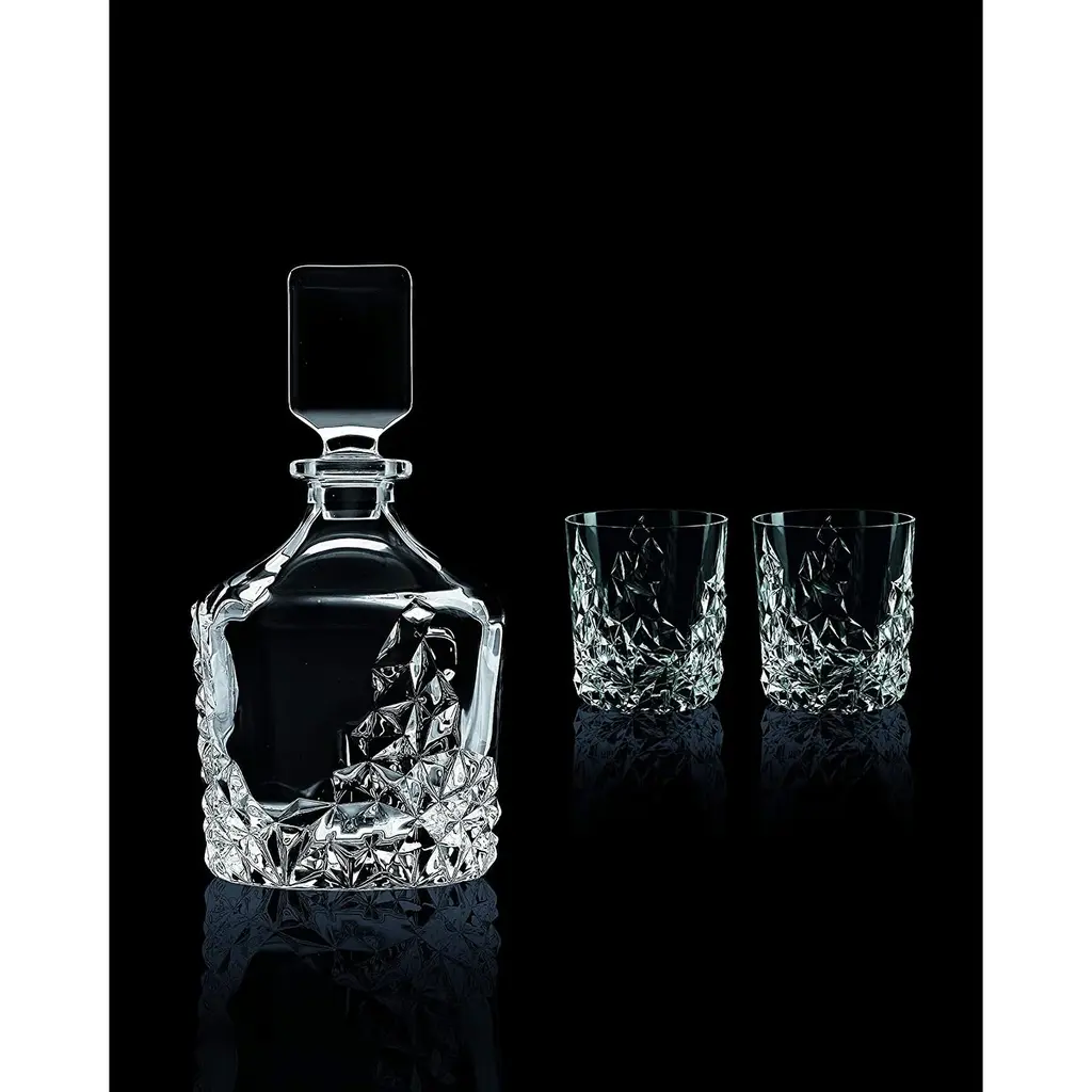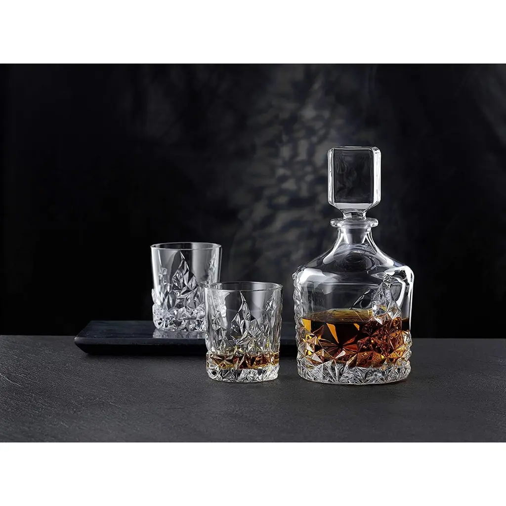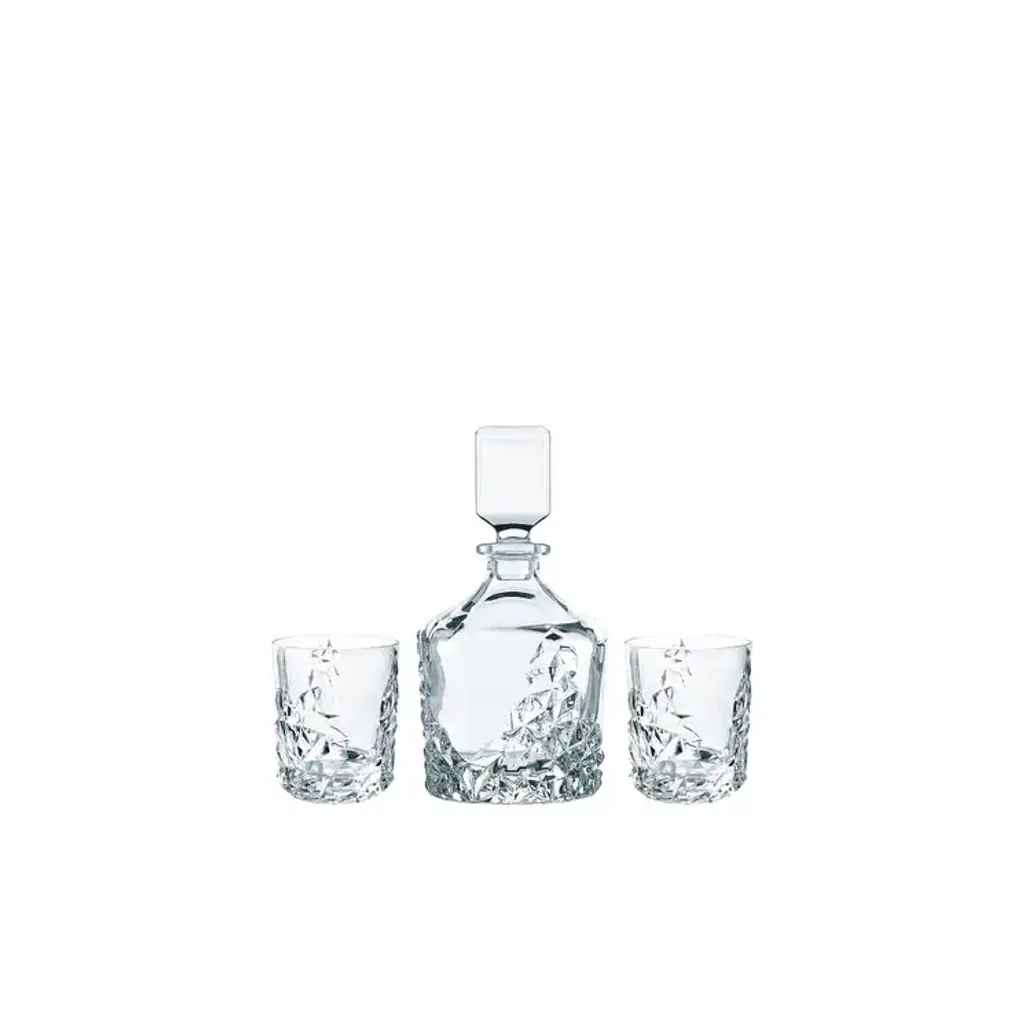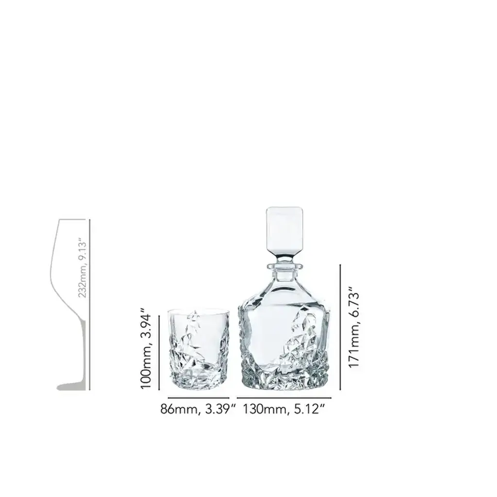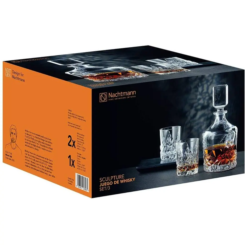 Nachtmann Sculpture Decanter Set w/ Stopper and 2 Whisky Tumblers - NewIn 2012, Ahmet Uslu, a student from Konstfack, University College of Arts, Crafts and Design in Sweden created a new line of products for the Nachtmann Brand - SCULPTURE. The complex geometry of the 'unfinished' part of the surface plays with the reflections of light. Along with the perfection of the finished parts and its brilliant light refraction they create a modern and extraordinary design. SCULPTURE is a modern sculpture as well as a vase or a glass. Our bourbon decanter is made in Germany using carefully selected fine sands and raw materials. For this reason, the liquor decanter and glasses are dishwasher safe and incredibly durable! The whiskey gift set is a great gift idea for birthdays, weddings, anniversaries, Christmas, Mother's Day, Father's Day or Valentine's Day.FEATURES:COLOR:MATERIAL:WHAT'S IN THE BOX:PACKAGING: Retail Packaging