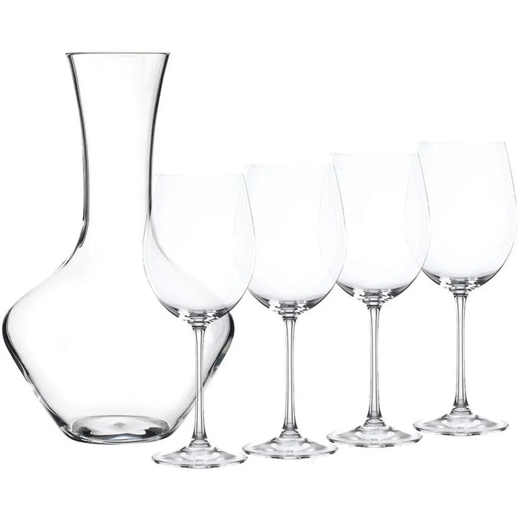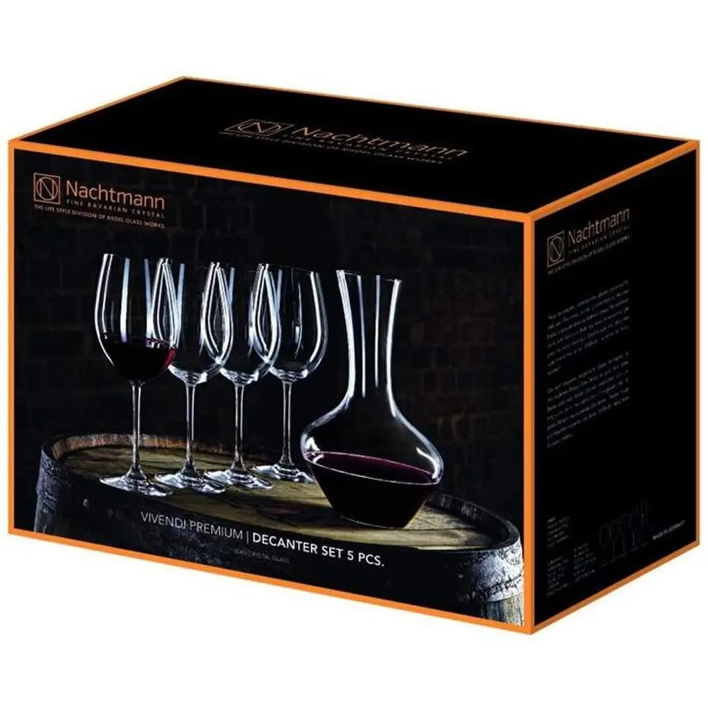 Nachtmann Vivendi Decanter with Glasses, Set of 5 Pieces - Clear - NewThis set contains 4 Bordeaux glasses and 1 decanter. The elegant machine-made set of four Bordeaux glasses and the decanter of the contemporary glass collection Vivendi convince with style and tasteful design. The set has been created to provide maximum pleasure of drinking to all red wine lovers, starting from decanting the wine and going on with the enjoyment of the wine. The functional glass collection Vivendi is a series for every day and every occasion. All around the world renowned restaurants use Nachtmann glasses and crystal ware for the setting table.FEATURES:COLOR:MATERIAL:WHAT'S IN THE BOX:PACKAGING: Retail Packaging