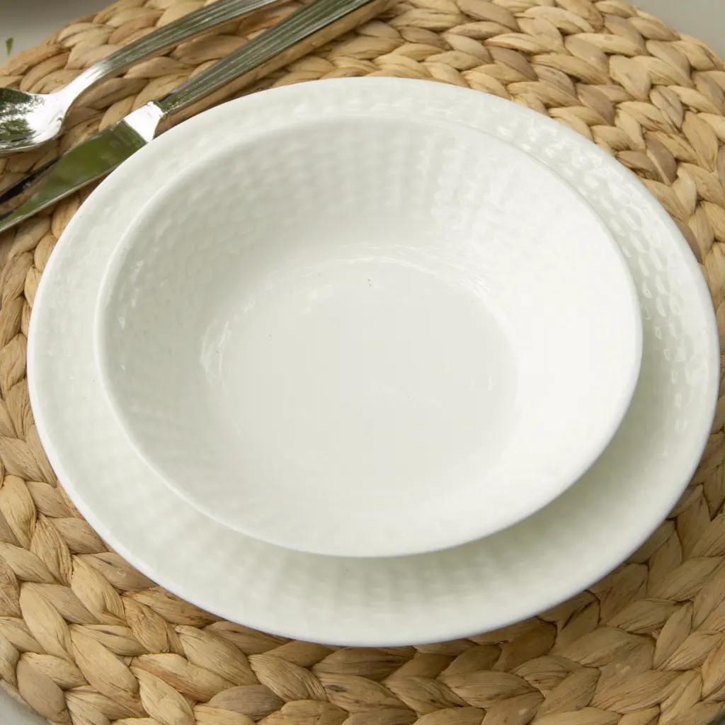 This eclectic service with its beautifully-detailed basket-style relief is an "everyday" white china for those who appreciate the unique. Bone china.