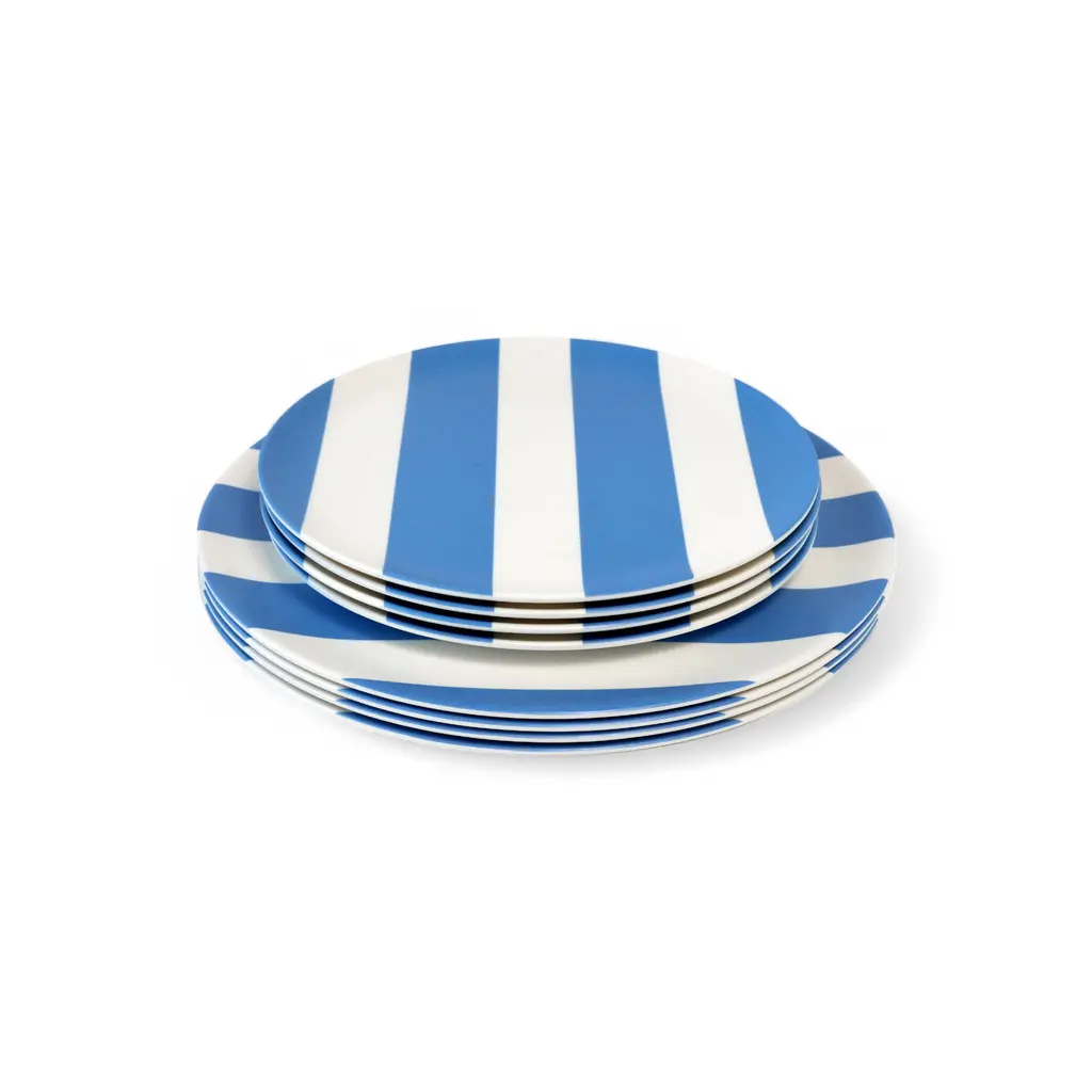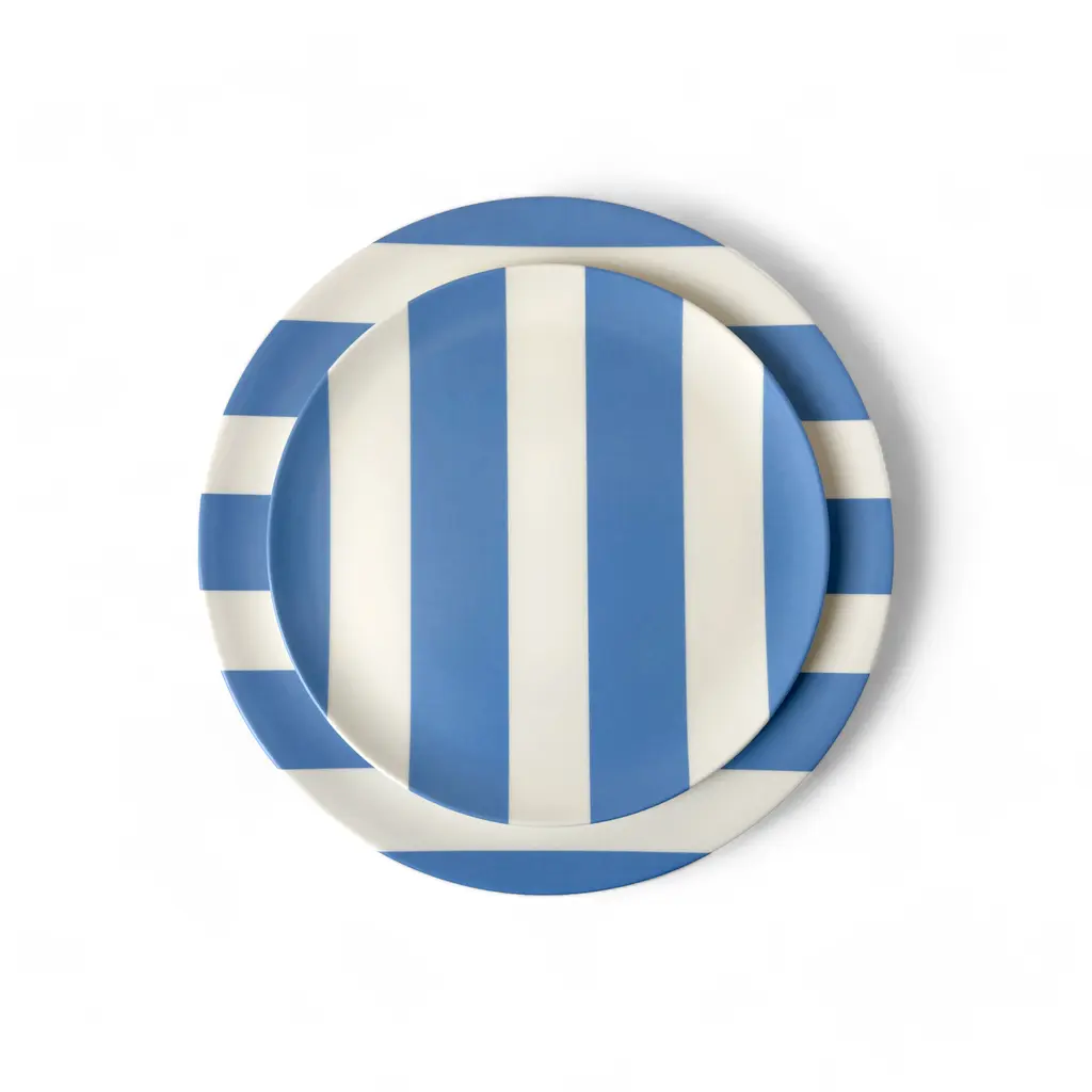 Inspired by coastal landscapes, these bamboo and melamine plates, blue and white offer a great way to brighten a picnic, campfire dinner, or lunch in a garden. The nautical-style design of the Naples Blue Dinner Plate reimagines the classic line pattern with thicker stripes, to make any food look better. Apart from its vibrant good-looks, this dinner plate also makes your outdoor gatherings more eco-friendly. To produce it, Xenia Taler uses a composite material made with bamboo fibers and melamine, in a manufacturing process that uses less energy and water than ceramic or glass dinnerware. Shatter- and scratch-resistant, the plate is also lightweight and easy to pack in a picnic bag, for example. The Naples bamboo and melamine plates, blue and white also come in a slightly smaller side plate version for snacks or desserts. Please keep in mind that the Xenia Taler collection of bamboo tableware is made with a resin binder and is NOT microwave-safe.