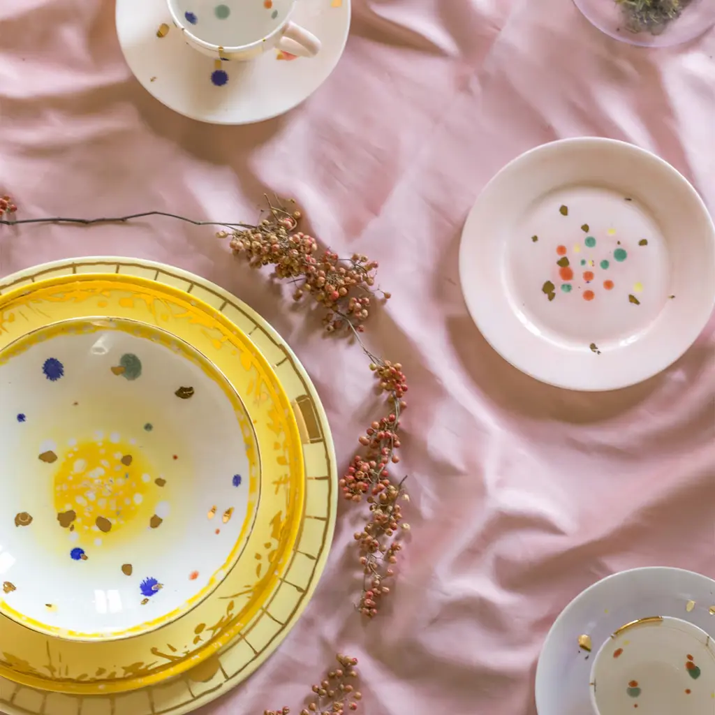 The Naples Soup Plate from the Florida collection radiates luxury and cheer, embodying the vibrant spirit of Florida since its launch in 2023. Inspired by the state's colorful heritage, this soup plate features a sunny Naples yellow, reminiscent of its stunning beaches and sunsets. Its design includes a lightly colored center adorned with multicolor dots, adding a whimsical touch. The rim is beautifully embellished with golden leaves, enhancing its elegance.
