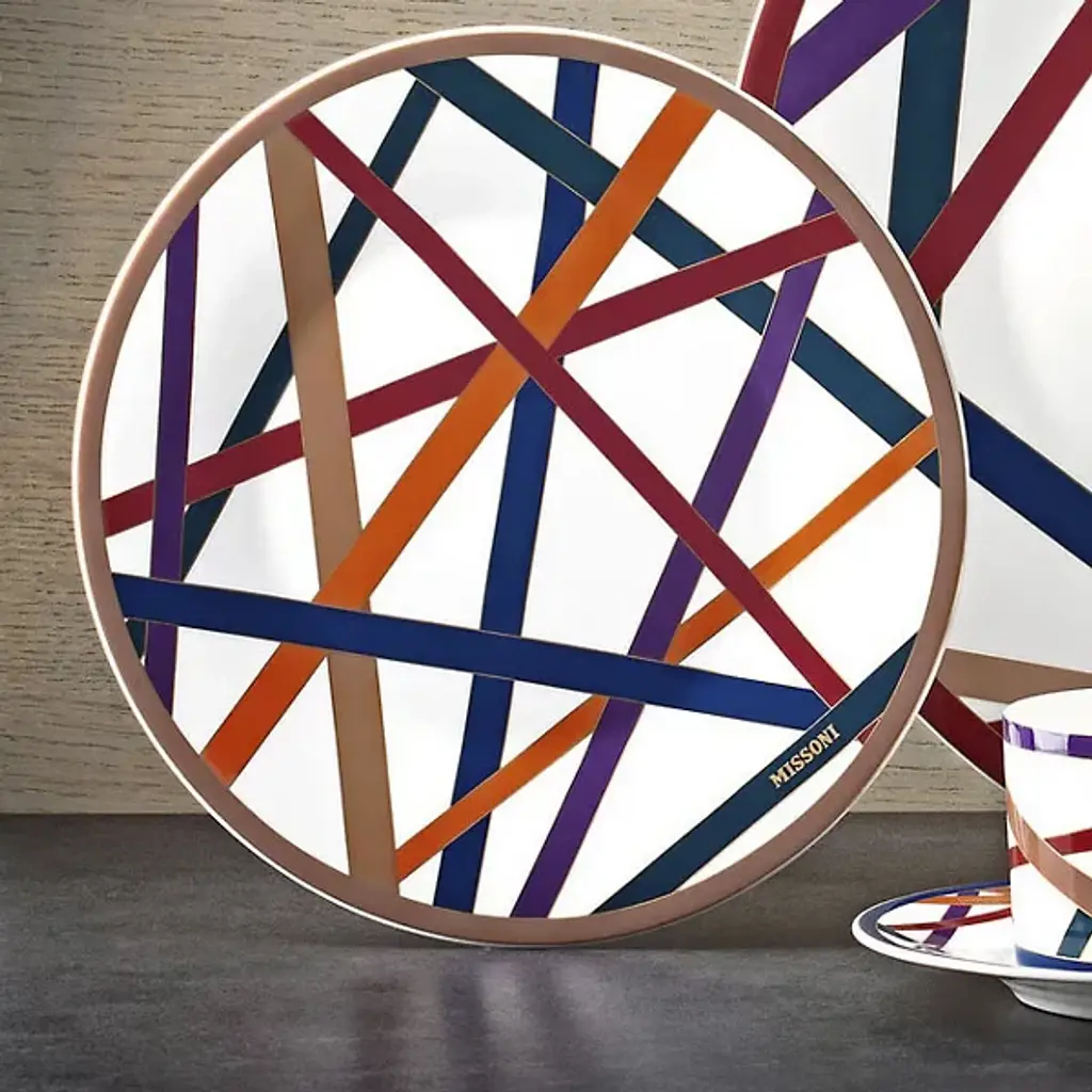 The Nastri Dessert Plate, Set of 2, from Missoni brings a vibrant touch to the table with its flowing ribbon-like design in a harmonious blend of blue, bordeaux, purple, beige, green, and orange. Made from fine bone china, these plates combine artistic flair with everyday function, adding a colorful accent to any meal. A perfect balance of style and practicality.
