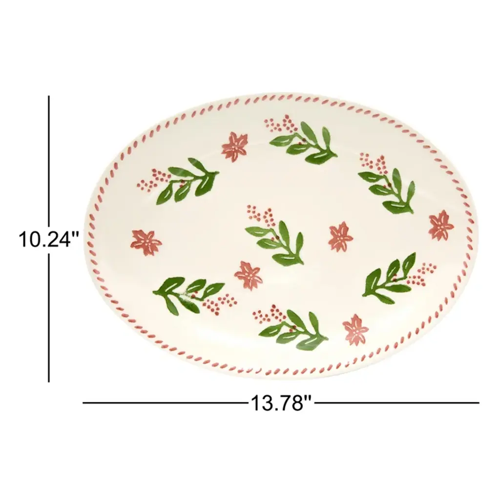 Celebrate the holidays – or any occasion – with this charming serving platter. It showcases a delicate floral design in festive red and green, adding a touch of warmth and cheer to your table. Crafted from chip-resistant earthenware, this durable platter is ideal for serving seasonal treats or your favorite culinary creations. A candy cane-like border and smooth, glossy finish enhance its classic appeal. While microwave-safe for added convenience, we recommend washing this piece by hand to keep it looking its best.