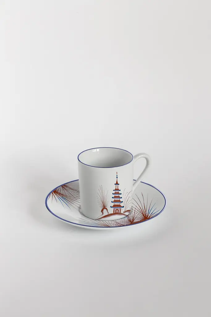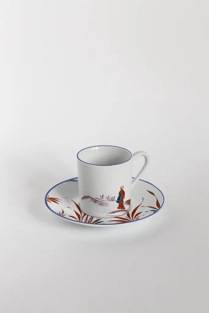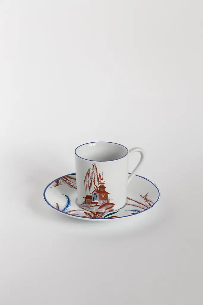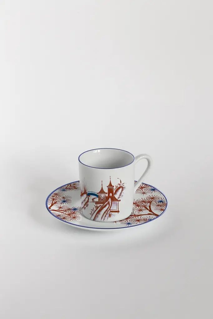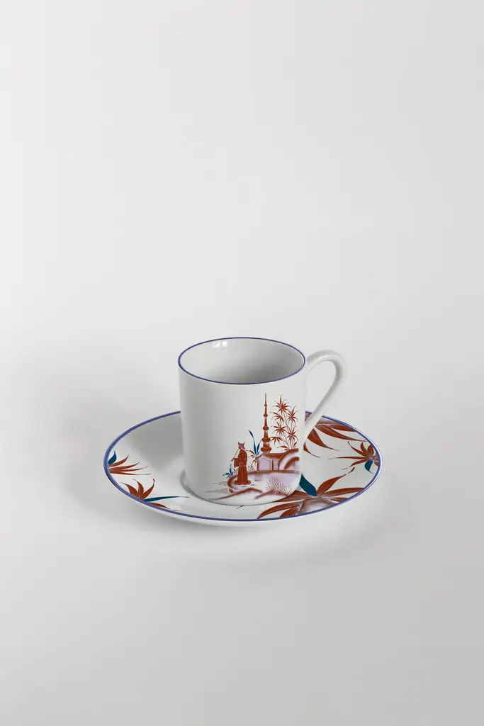 Bordeaux and blue are the primary colors of this Japan inspired collection of plates, where ancient Japanese scenes take place on the rivers of a fairy lake.Coffee set with 6 coffee cups and plates.
