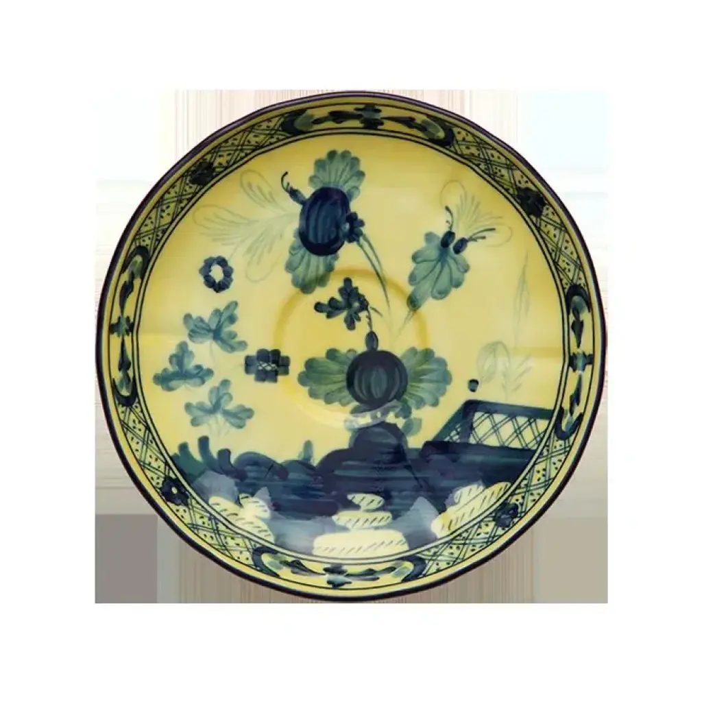 An extraordinarily graceful Japanese landscape graces this handcrafted porcelain soup plate by the artist Vito Nesta. Paying tribute to the Japanese Imari traditional three-color palette pattern, exquisite ivory and delicate red dominate this peaceful scene. A single accent of cobalt blue appears on one ship and on the plate's rim.