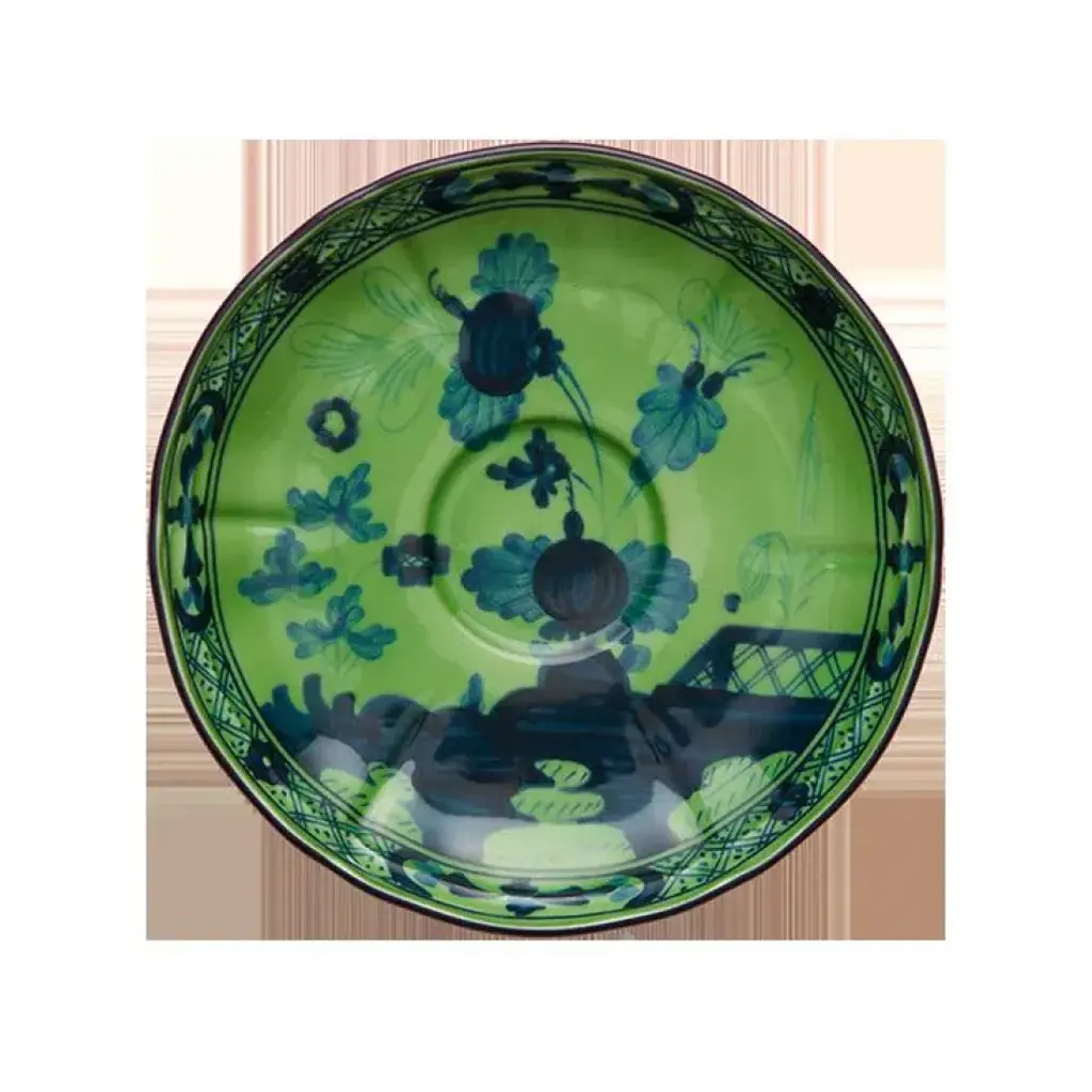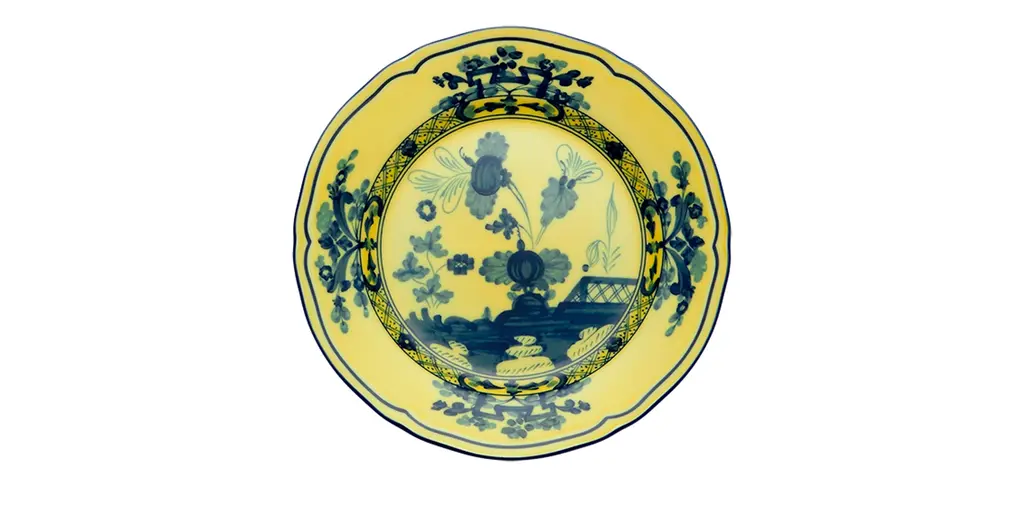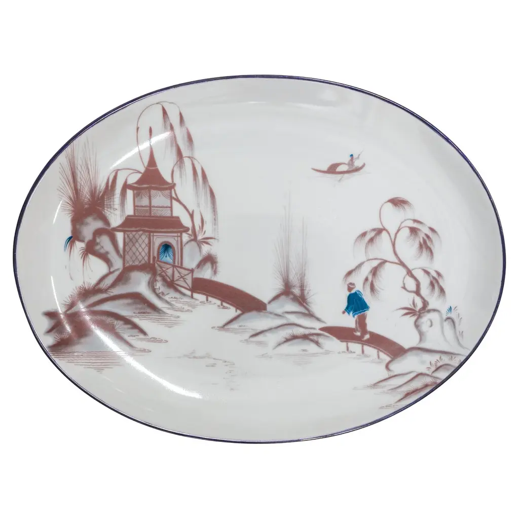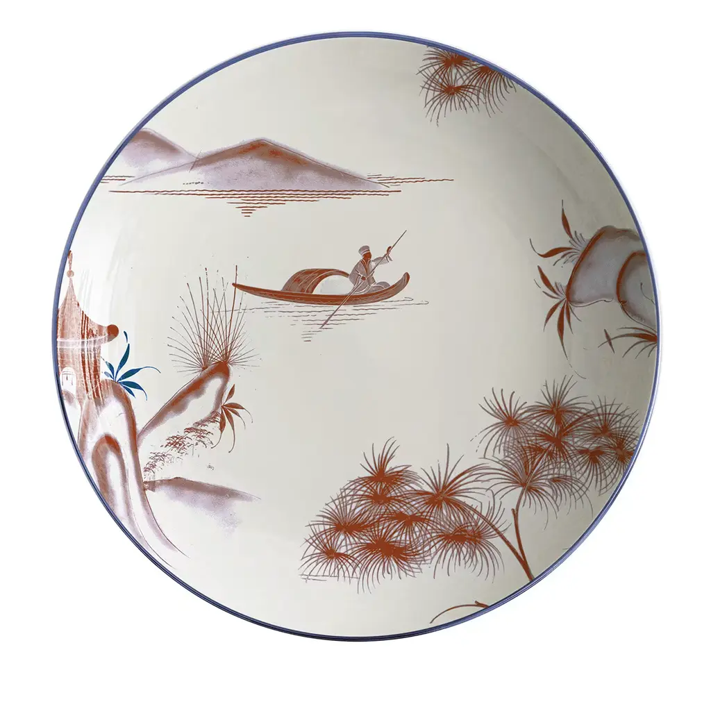 This exquisite handcrafted porcelain soup plate belongs to the Natsumi series of artist Vito Nesta's signature Grand Tour Collection. A tribute to the Japanese Imari porcelain tradition, this serence river scene features delicate reds on ivory with a single, cobalt blue accented blossom rendered using deft brush strokes in a simple three-color palette