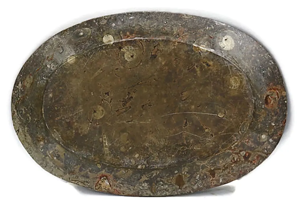 Polished marble platter with natural ammonite fossils. Very heavy piece, carved from a single slab of marble. Encased in the marble are fossils dating back millions of years. No maker's mark. Light wear, minor surface scratches.