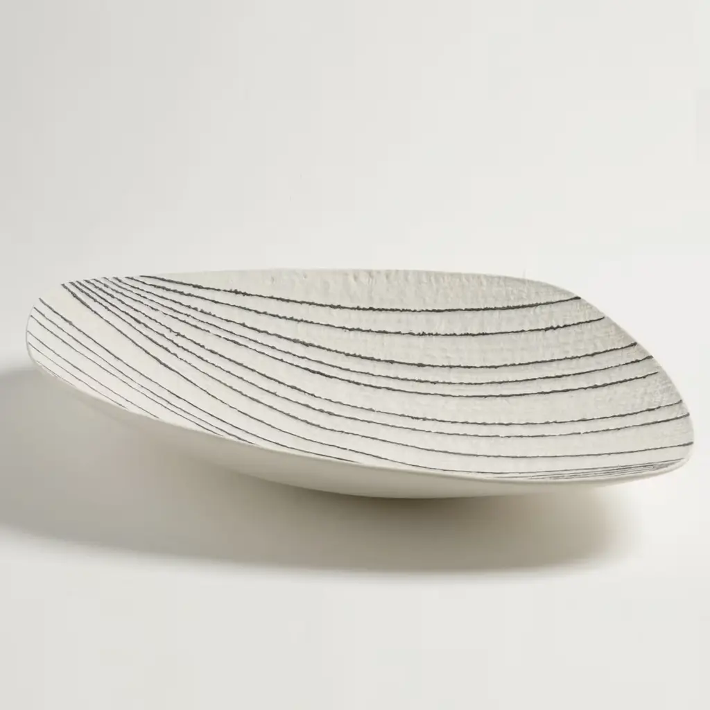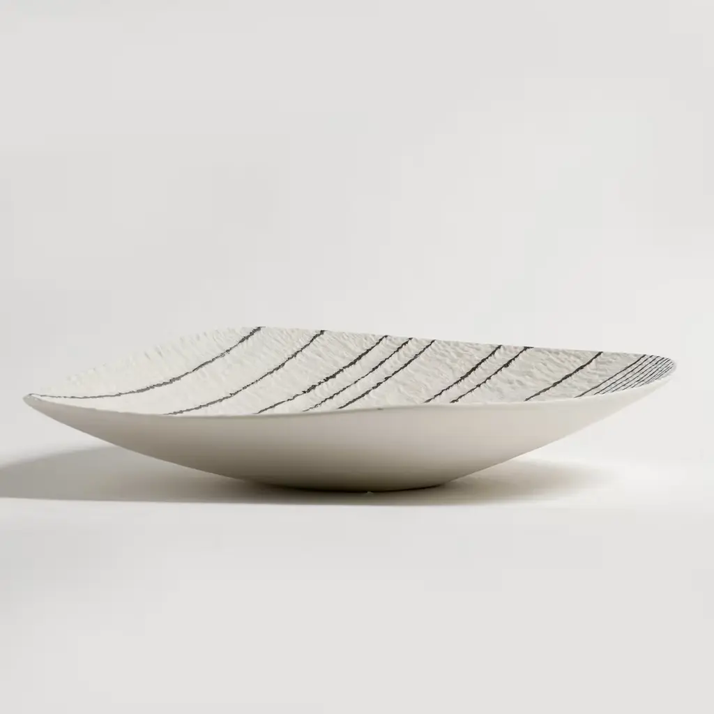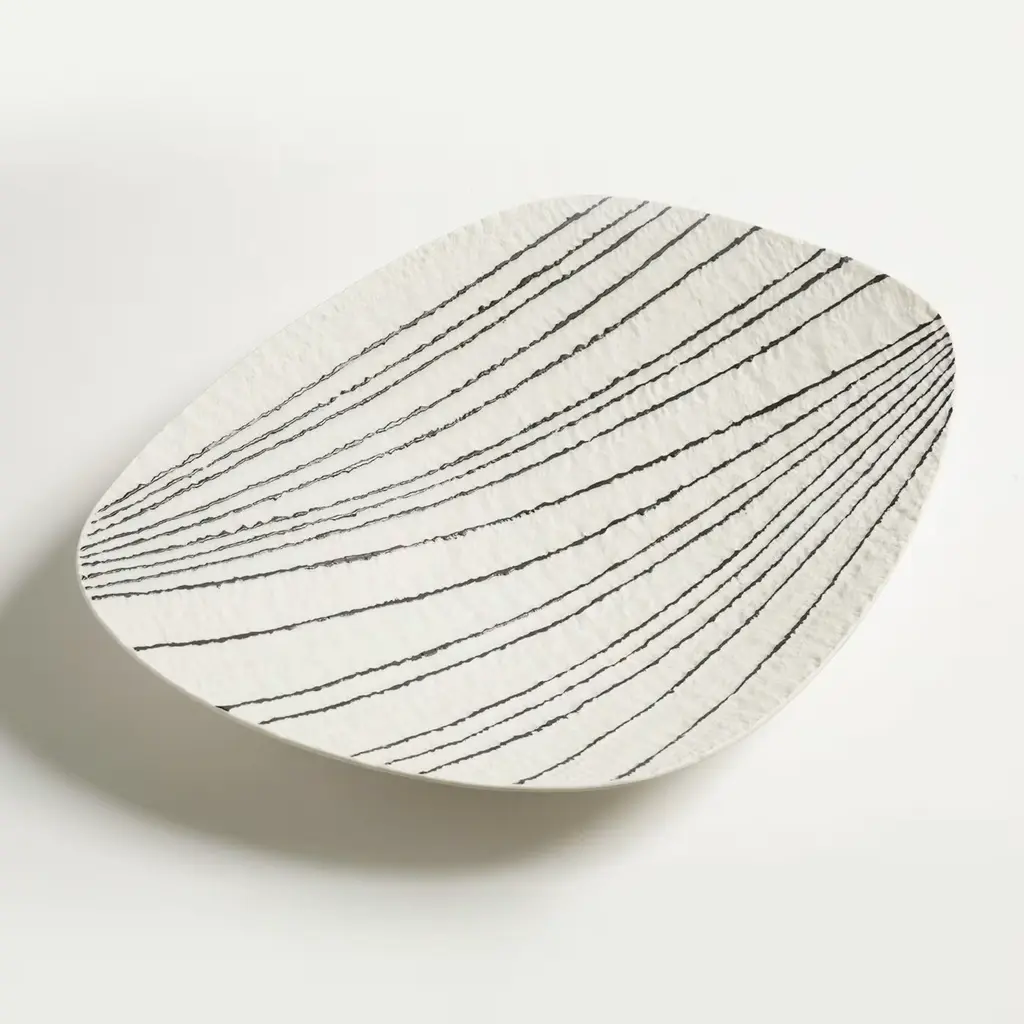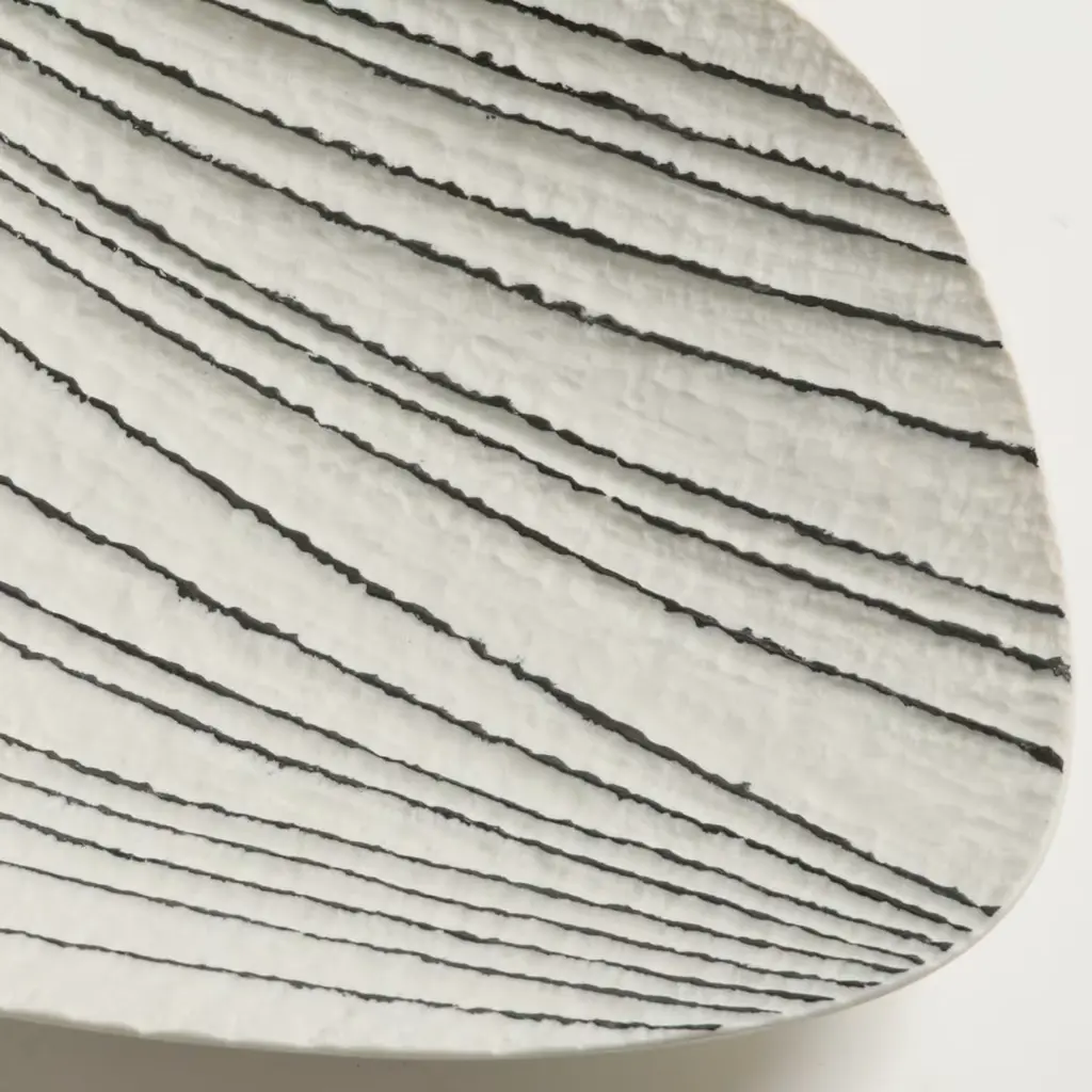 In this elegant plate, the timeless juxtaposition of black and white plays harmoniously with the lines and grooves that enrich its texture. A meticulously crafted mold and the use of unglazed porcelain, or "biscuit", make this piece an exquisite objet d'art.