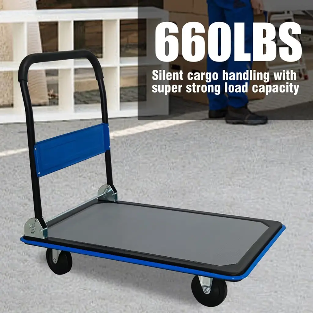 The NAYSAYE Foldable Platform Dolly is a versatile and durable flatbed cart designed for heavy duty loading and storage. Its foldable design allows compact storage while TPR silent wheels and 360 degree swivel casters provide smooth, quiet movement across any surface. The rubber wrapped handle ensures comfort during transport and the anti slip plate keeps cargo secure. Ideal for home, warehouse, travel, or utility use, this dolly handles up to 660 pounds effortlessly.